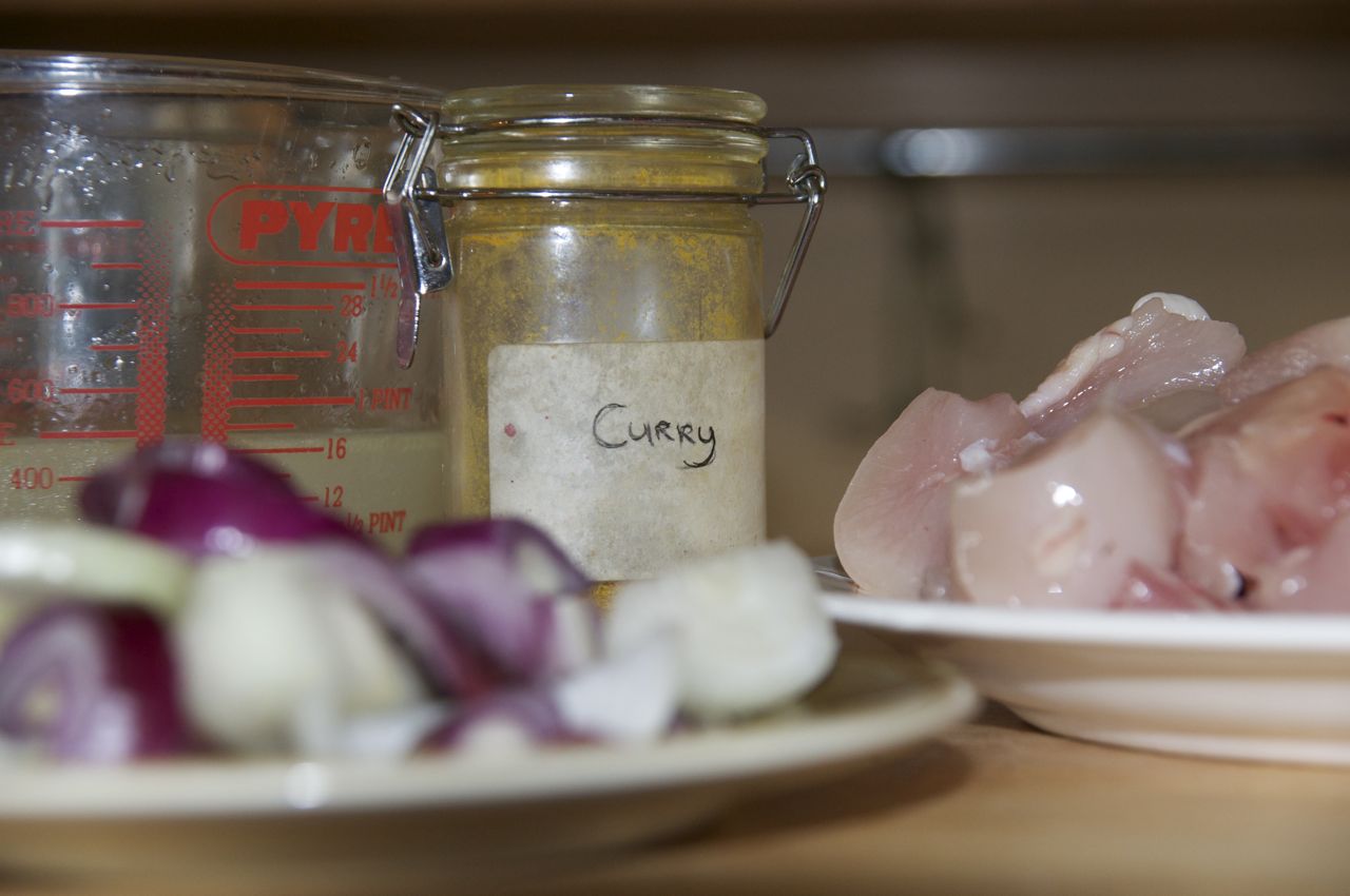 You can’t get whole chikens in the shop in Finland, you can only get portions or what they call broiler meat. We used a large breast and two thighs which we had cut up into portions when we bought our organic chiken from Irish Organic meats at Boyle farmers market, Hanna ground up the curry spices fresh, and the chicken stock came from our freezer, made from the carcass of an organic chicken after portioning it up. We use brown basmati rice.