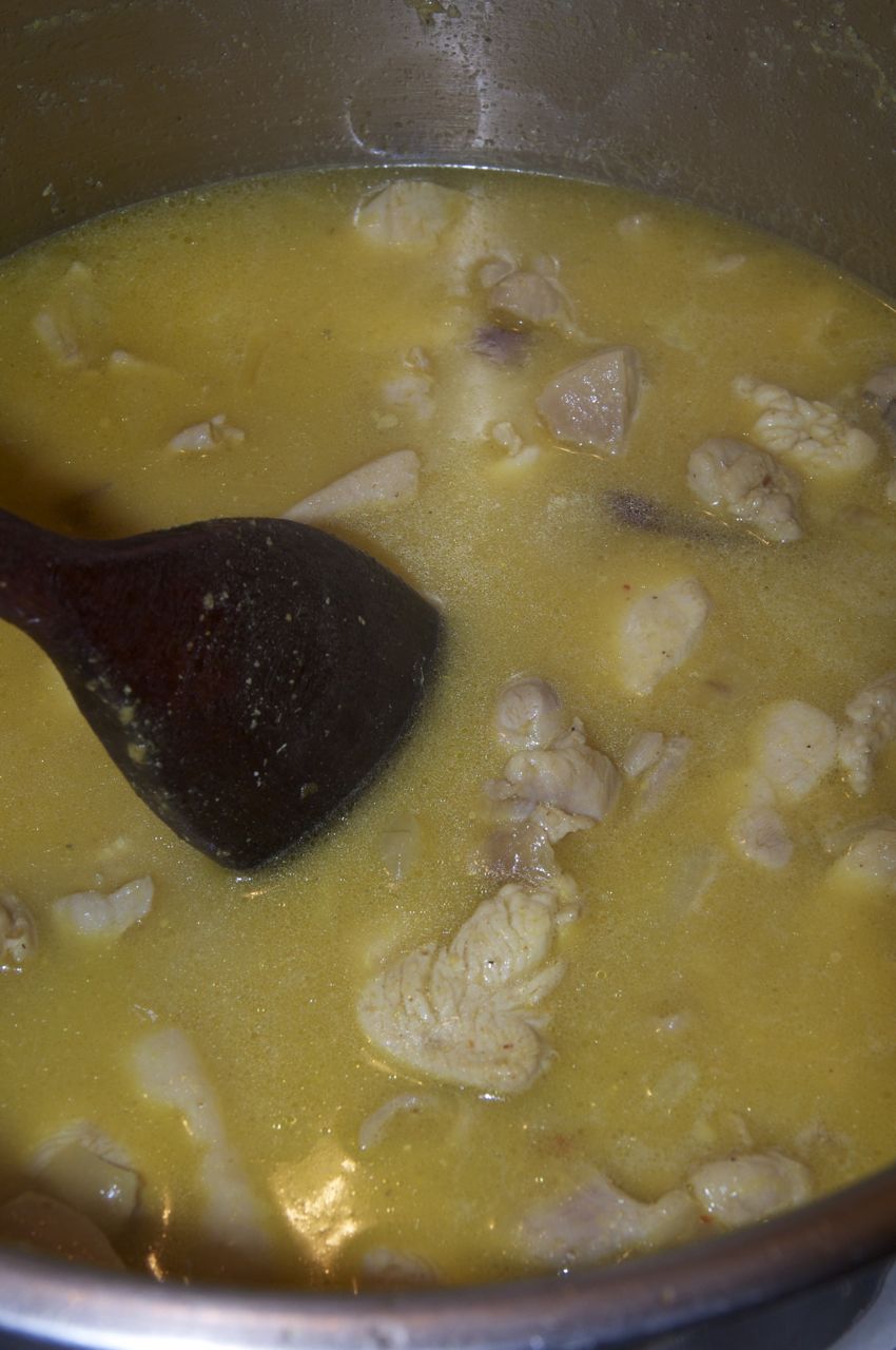 - Pour in the chicken stock, turn up the heat until the liquid boils and then lower the heat and cover the pot.