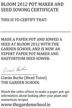 EVERYONE WHO VISITS BLOOM CAN DROP INTO THE GARDEN SCHOOL AND LEARN HOW TO MAKE A POT FROM NEWSPAPER, FILL IT WITH PEAT FREE, ORGANIC COMPOST AND THEN SOW A NASTURTIUM SEED. THEN YOU CAN BRING YOUR POT AND SEED HOME AND WATCH IT GROW.