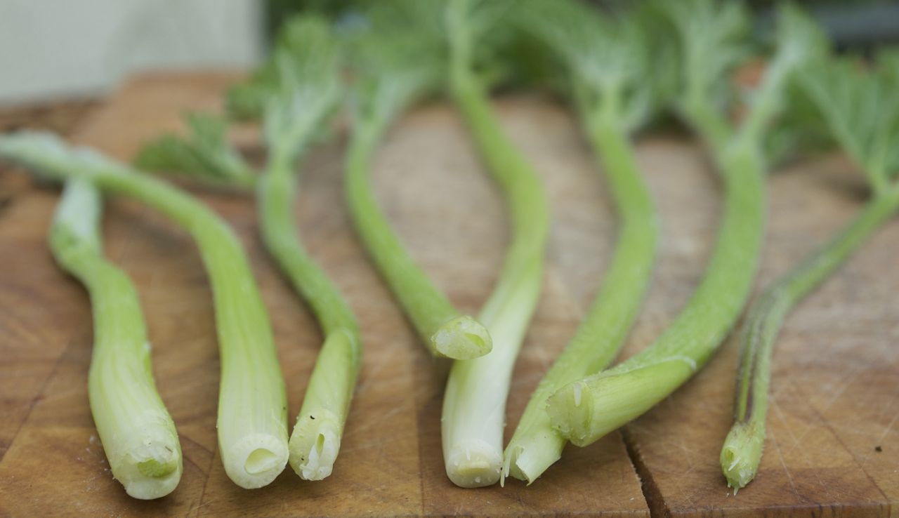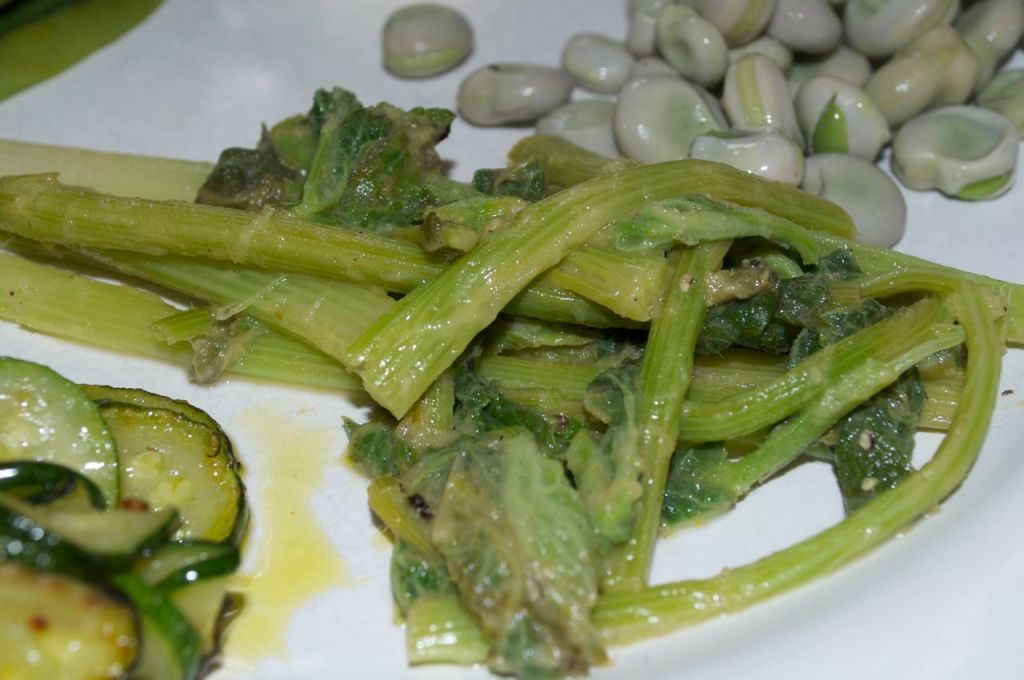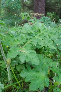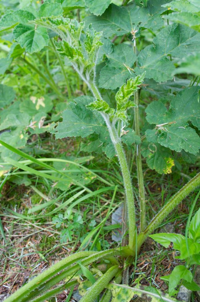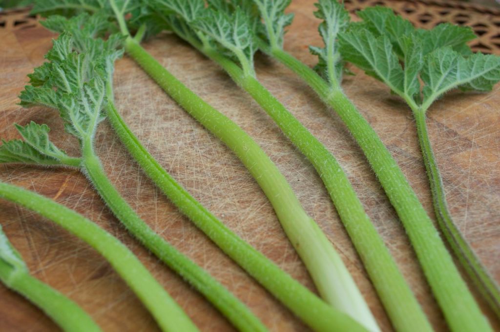 I have to admit I was a little skeptical, but such was Roger’s praise for the new shoots of Heracleum sphodylium, he says that is one of the best vegetables that he has ever eaten, that I just had to try it. Before harvesting the new shoots growing from the base of the plant I made double sure to check that the plants growing in our garden were indeed the hogweed, H. sphodylium, and not another plant from the Parsnip family once called Umbelliferae but know named Pastinacaceae. Many members of this large plant family could be easily confused and the wrong plant harvested, which could have disastrous results, some are poisonous. The related H. montegazzianum is a much bigger plant with monstrous leaves and over sized infloresences, the sap of all parts is a severe irritant.
