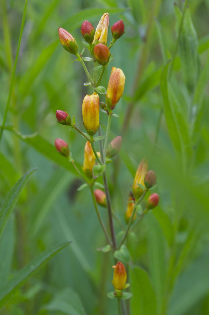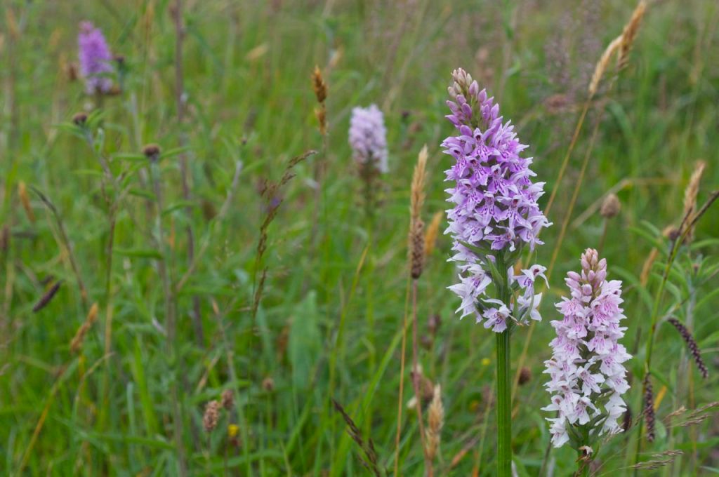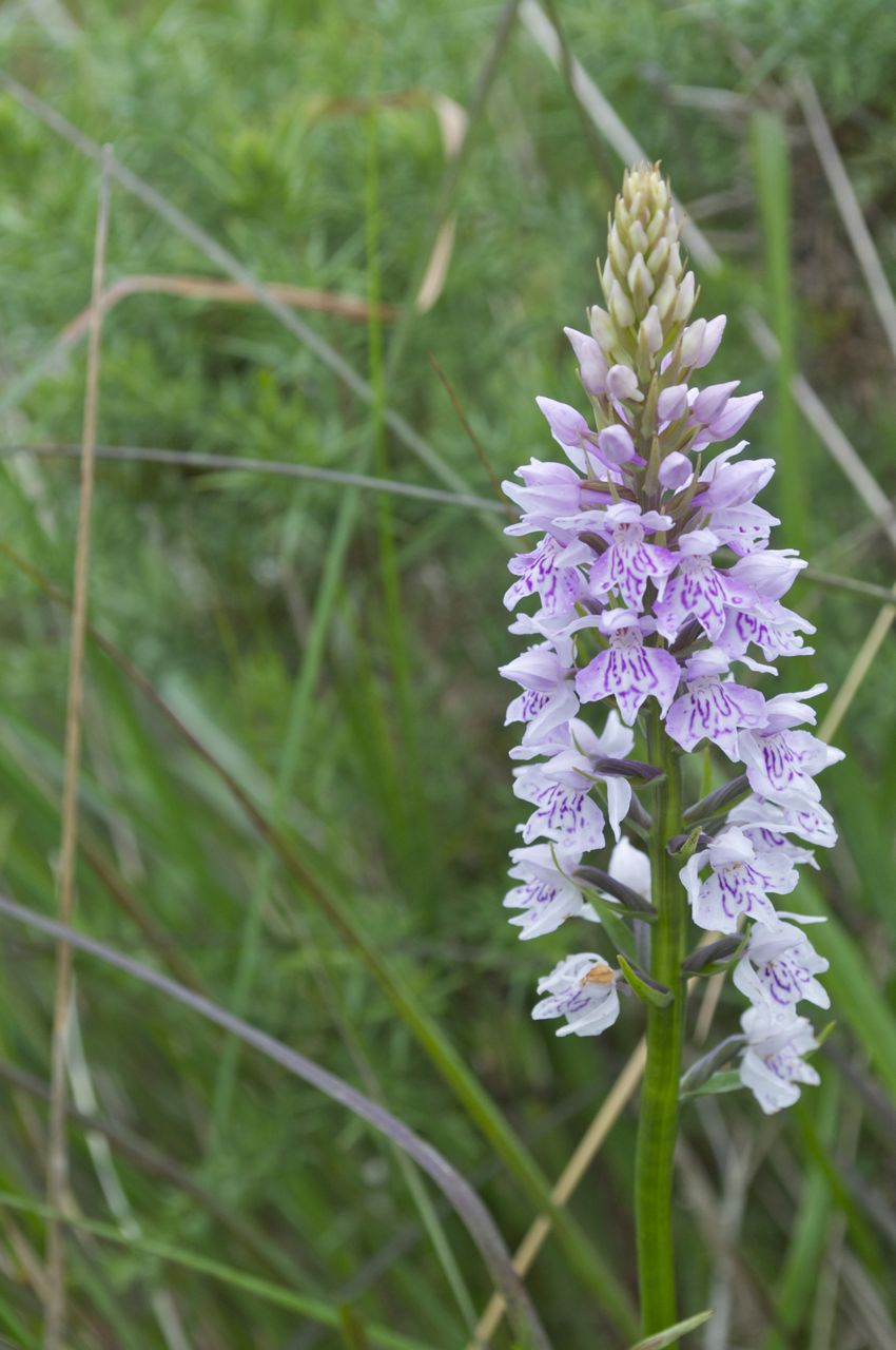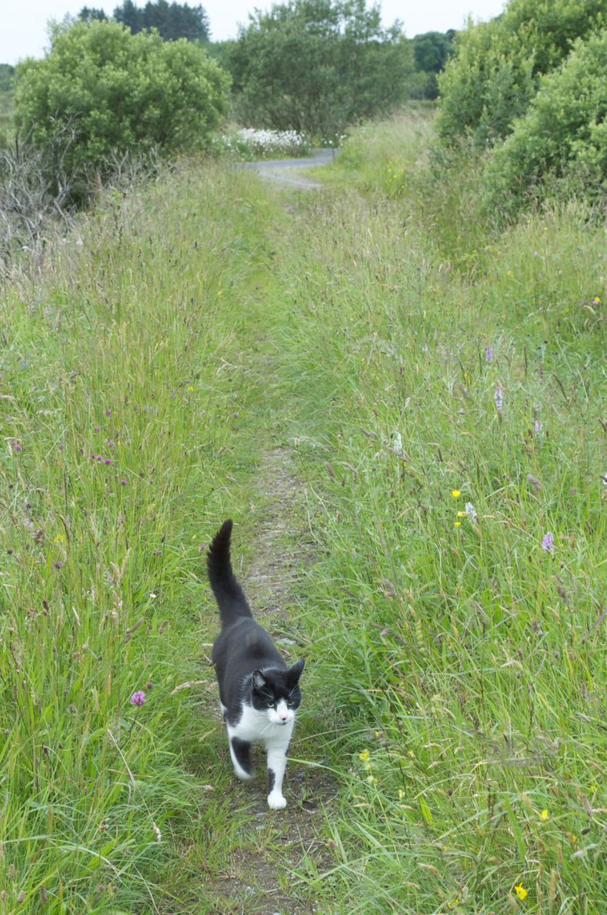 We walked along the tarmac road where the vegetation attempts to reclaim the paving from the centre and the edges. On the ditch we picked a handful of Fraochán berries, the fruit of Vaccinium myrtillus otherwise known as billberries. We turned to the track, preserved as passable by the occasional tractor that drives along it. Along the centre spotted orchid flowers blossom in the long grass, different colour variations of Dactylorhiza maculata. The red buds of a St John’s Wort, Hypericum pulchrum known as Beathnua baineann in Irish, flowered to the side of the path. I heard a squeaking sound behind me, an all too familiar noise. One of our cats, Danzig, decided to follow us, he came bounding along the tyre tracks stopping to whizz on the odd orchid along the way.