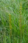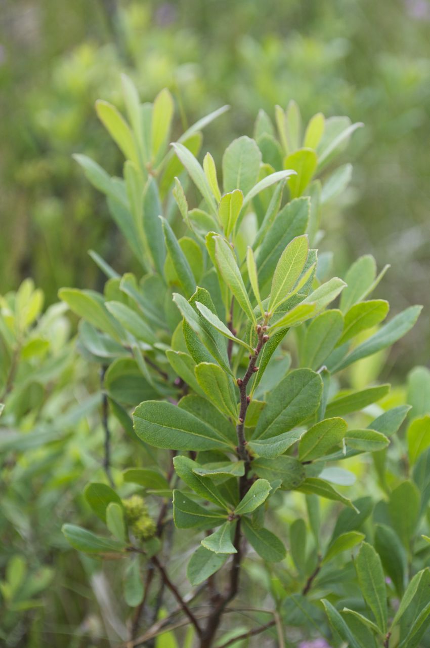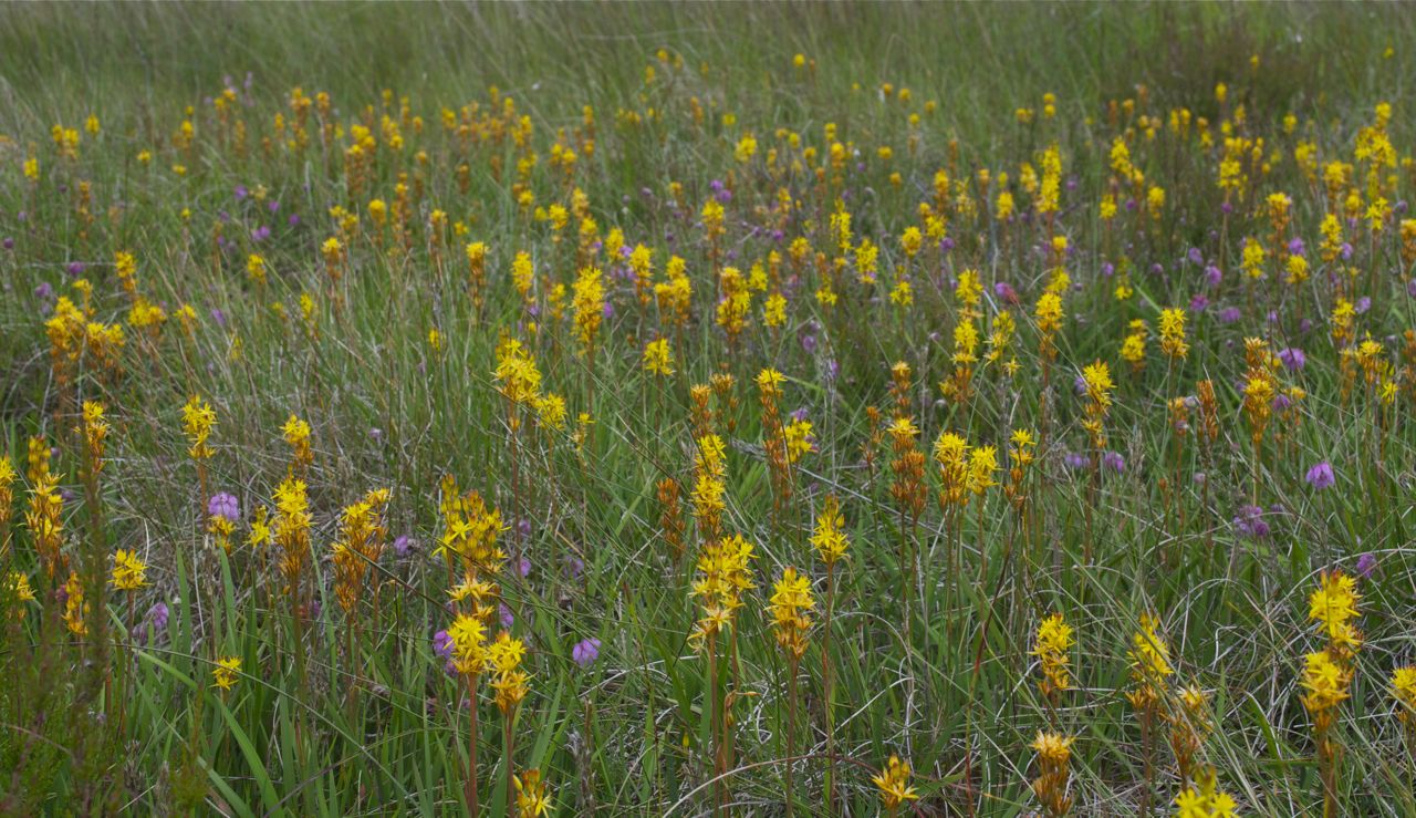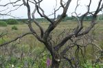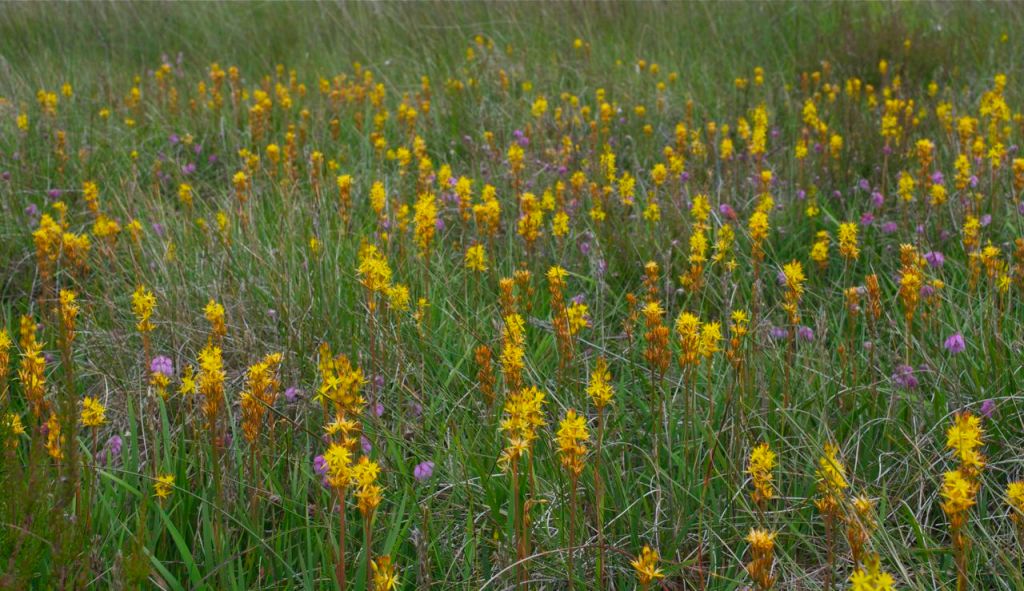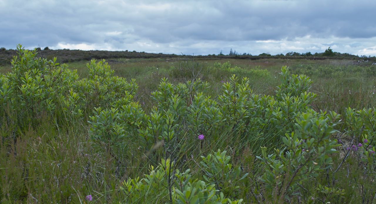 We found a way over the ditch, walking carefully so an not to trample the orchid, Listera ovata, with its conspicuous pair of round leaves and inconspicuous tiny green flowers. The bog myrtles, regenerated after the inferno, fragrance the air, some of the sweet aromatic foliage collected to flavour a mead which I made when we got home. Red sphagnum moss forms a deep pile above the wet peat, our boots sinking with each moment spent stationary. We had to keep on the move!