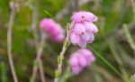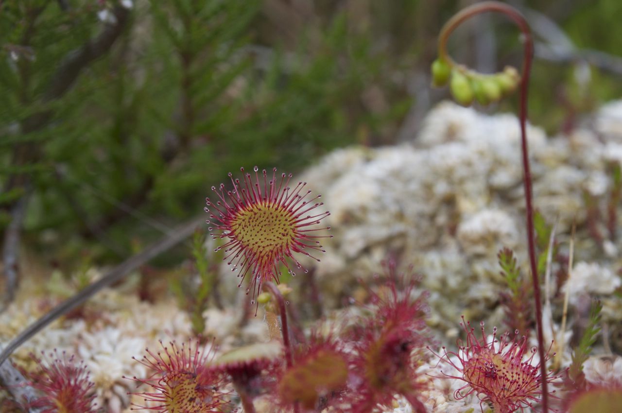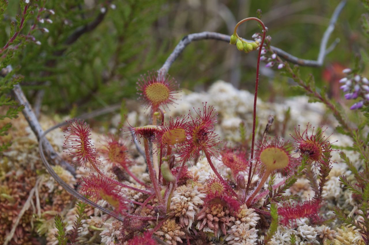 Three species of heather, two species of Erica flowering, a Calluna with its buds, deer grass, Trichophorum cespitosum and swathes of the tiny yellow bog asphodel, Narthecium ossifragum were amongst the plants that caught our immediate attention. Almost buried amongst the red sphagnum was the real little gem, the insectivorous sundew, Drosera rotundifolia. This carnivorous plant traps insects on it’s sticky leaves and then releases an enzyme which digests the nutrients from the insect. One old belief was that the sundew could be used as a love charm due to the little plants ability to lure and entrap other creatures. Well, our bog lured us, and we love it. We will make frequent returns and observe the flora and activities of the fauna. Danzig our cat might return too, although he was quite tired walking home and did not object in the slightest to being carried by Hanna for the final leg of the journey.
