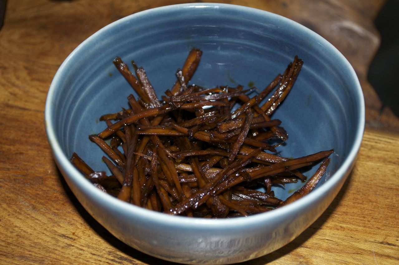 Luckily we had more than enough to work with for our tasty snack. When preparing a burdock root for cooking, wash it well. Then with a sharp knife remove the outer layer of the root and only use the central core. The outer parts remain woody even after cooking. The flavour of burdock root is mild and agreeable but the addition of the soy sauce when cooking gives it a salty zing. It is high in fibre, calcium, potassium, amino acids, and is low in calories. Also, as it is prepared in water and not frying it makes a healthy snack. I wish I had not weeded out so many burdock roots in the past…