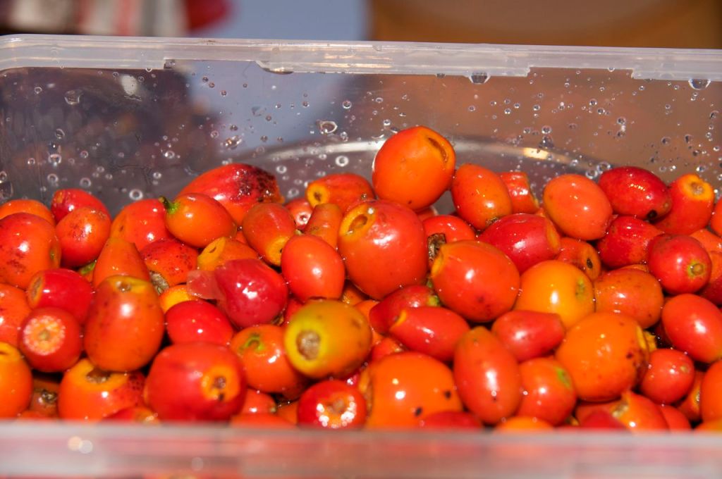 Rose hips, the fruit of the rose are easy to pick, once you get started its hard to stop. Wild dog rose, Rosa canina is ideal, and Rosa rugosa hips are also good. The bucket fills quickly, as you add more and more. Then you get home. Now you have to top and tail them. Remove the stalk from the base, and discard the leafy calyx from the top.