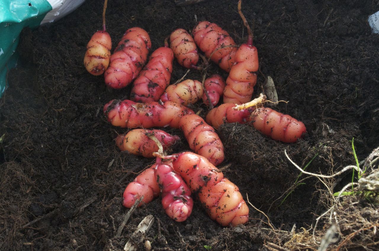 I found that plants in the polythene tunnel also got frost damaged when temperatures went below zero degrees Celcius (32F). As the days got shorter the students and I checked the plants weekly. After the tomato plants were cleared from our upper tunnel we moved the plants that we had been fighting for space in our potting tunnel to the bed vacated by the tomatoes. We laid the trailing stems of the Oca on the beds. Along the stems small tubers started to form. Portions of the stems that were covered with soil developed larger tubers. Next year I will earth up the tubers more as some close to the surface had holes eaten in them by birds. Otherwise the Oca were untroubled by pests and untroubled by diseases. I did not give any extra fertilizer to the plants while they were growing as the plants were growing so big, but addition of supplementary fertilizer low in nitrates might help increase the yield of tubers if applied late in the growing season. We kept the plants watered throughout the summer.