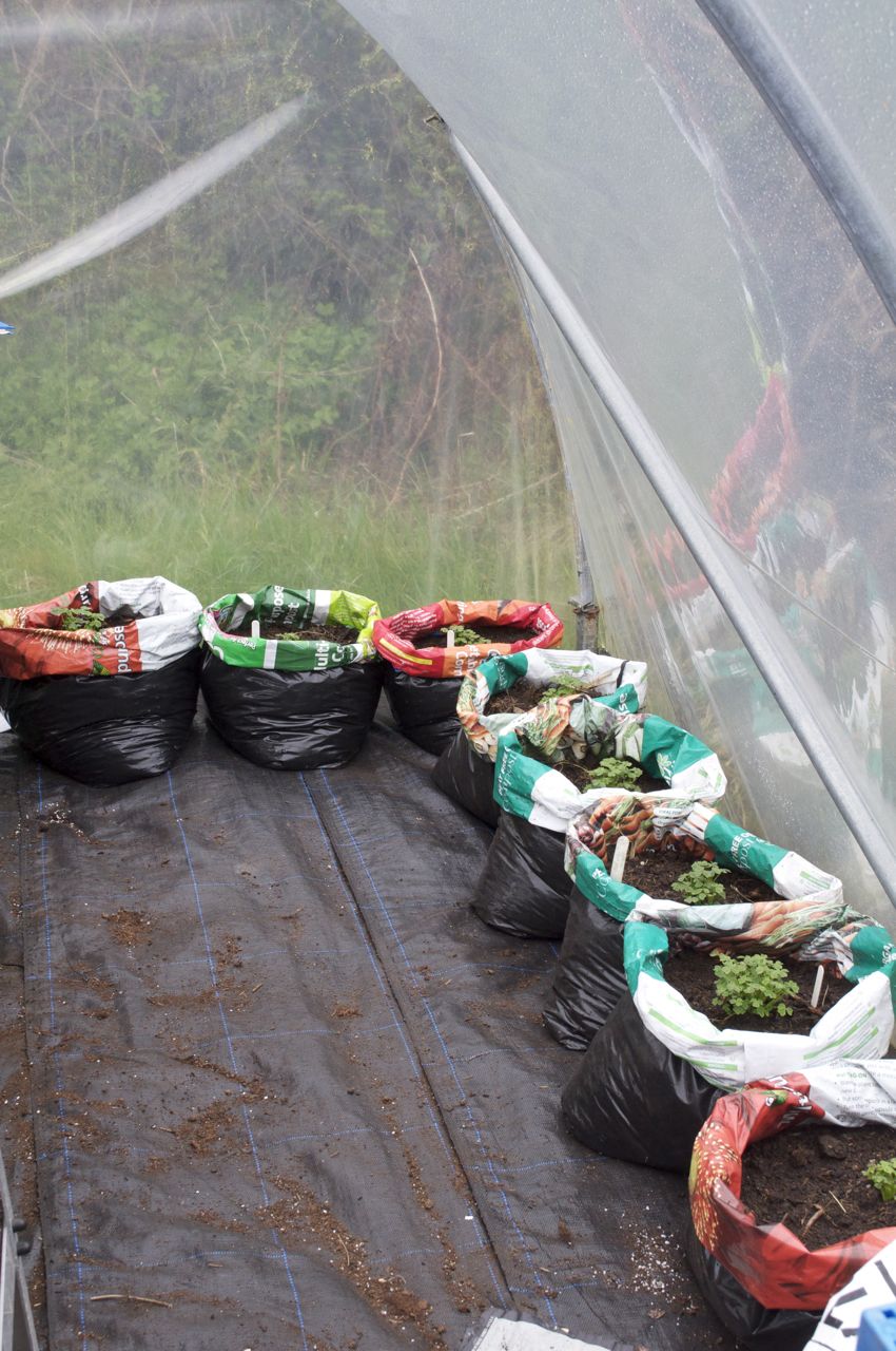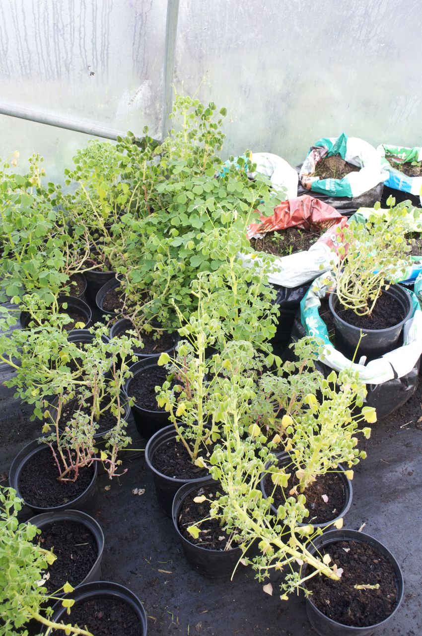 That was back in April. We planted the tubers in 2 litre pots of garden compost and later potted on the plants into re-cycled compost bags filled with more of the garden compost. These were kept in the polytunnel where we work with the students. The growth of the Oca was far more than I expected and by mid-summer we were battling for space with the South American vegetables.