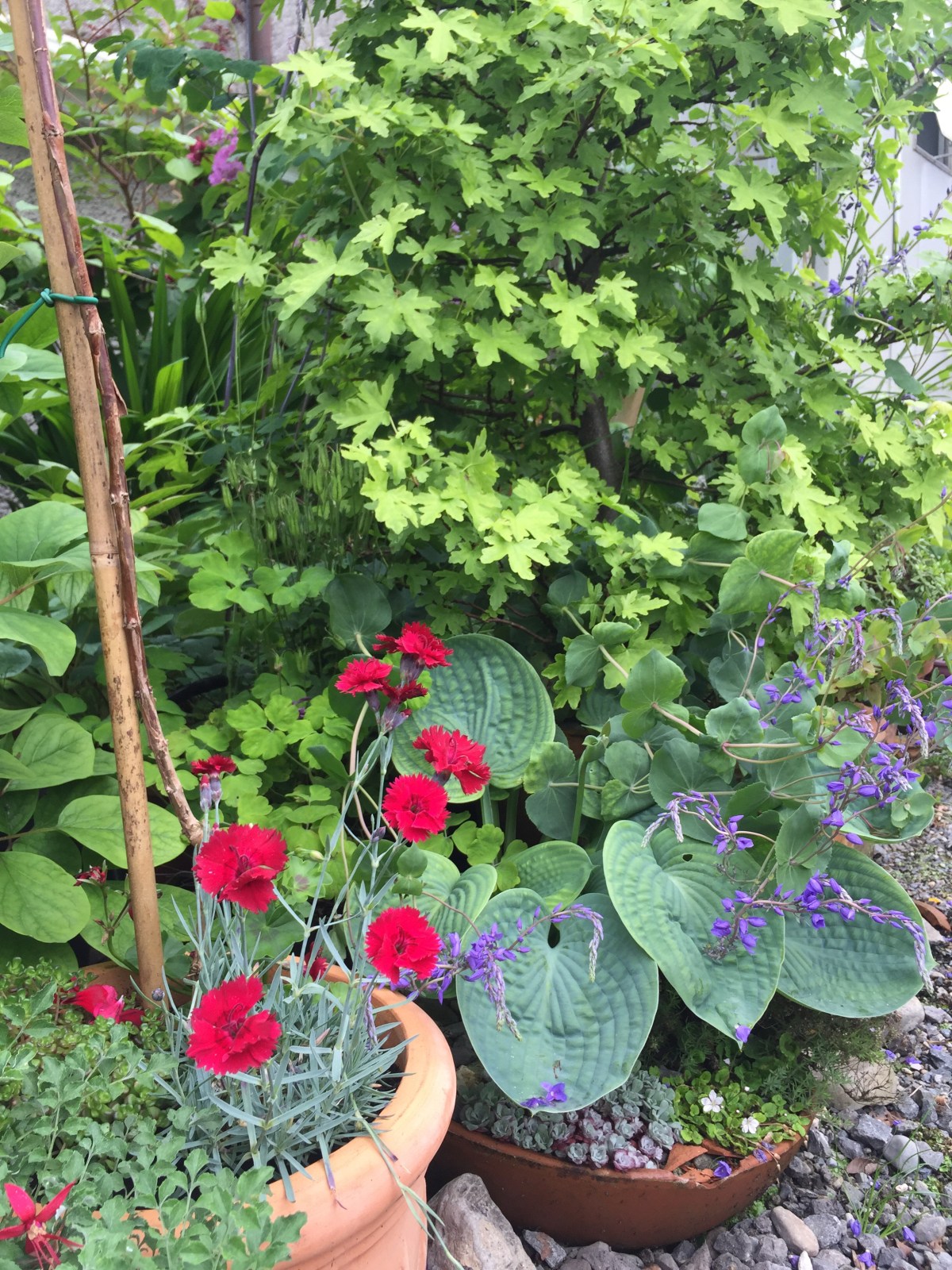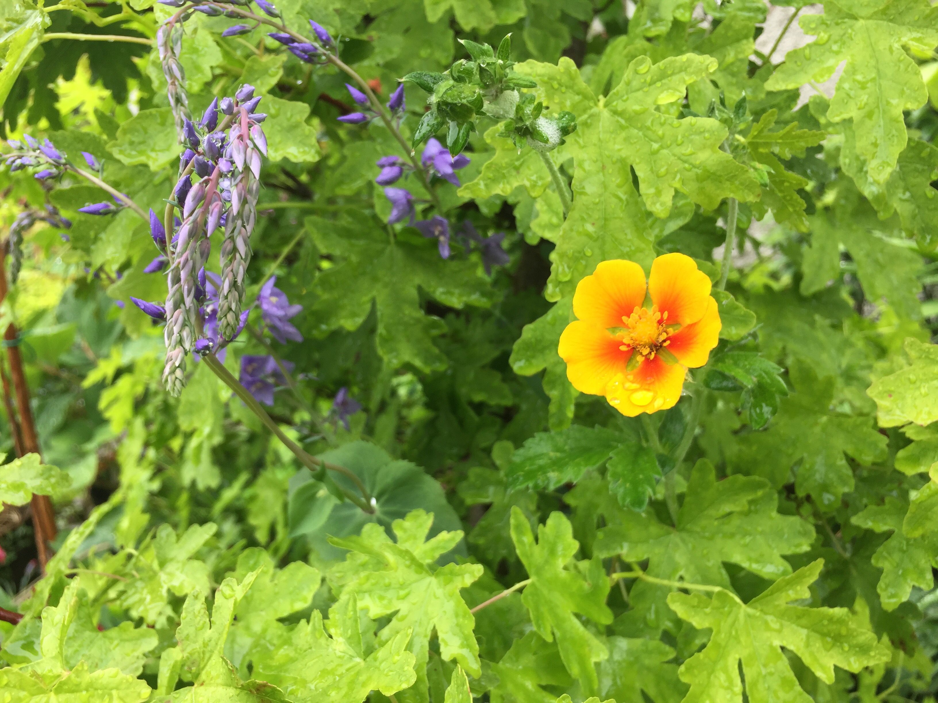In another a pot a combination from a couple of years ago continues to entertain;nth rough the dense foliage of a Liquidambar orientale a cheerful Potentilla scrambles without a care while the ever curious and intrepid stems of Parahebe perfoliata wander to explore every empty centimeter of the compost. The beautiful blue flowers dangle freely from the foliage of its larger pot cohabitant.