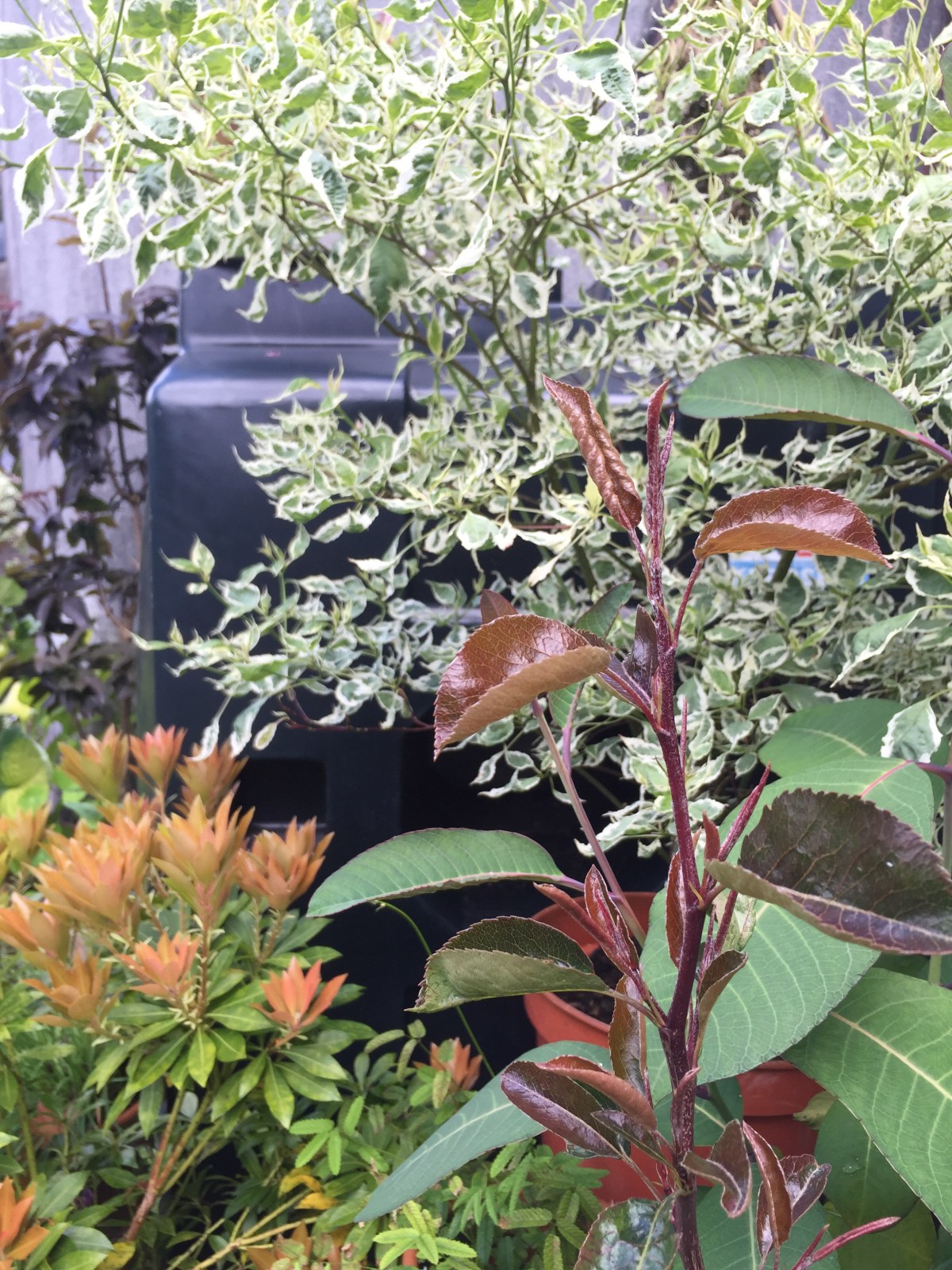 In our collection of pots, this Pieris japonica combines with other foliage plants to provide a foliar screen of an oil tank and together their colors and shapes mingle to create a leafy composition of beauty through the spring, summer, autumn and in some cases winter too.