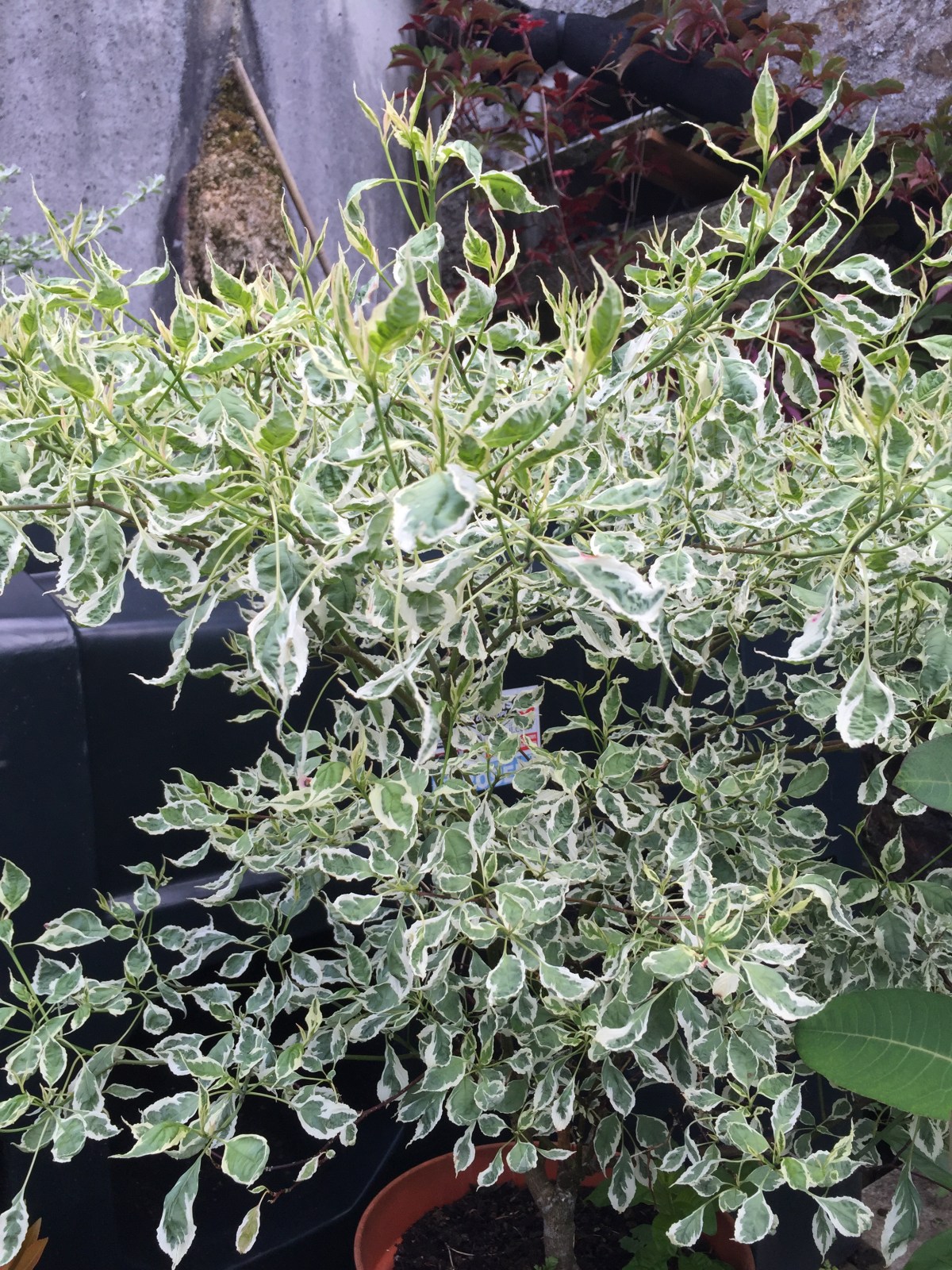 The silver variegated foliage of Cornus alternifolia ‘Variegata’ creates a soft fuzzed backdrop, it’s potis placed on a garden table to elevate it so that it distracts the eye from an ugly oil tank. A beautiful large growing shrub will take time to achieve its full height of 4-5 meters.