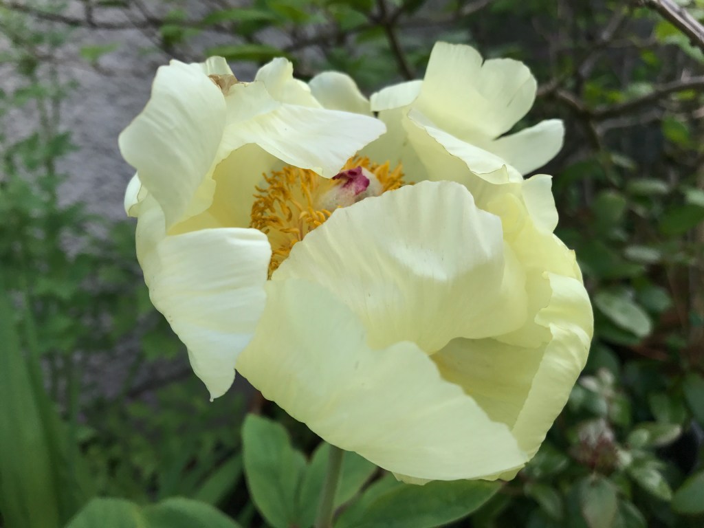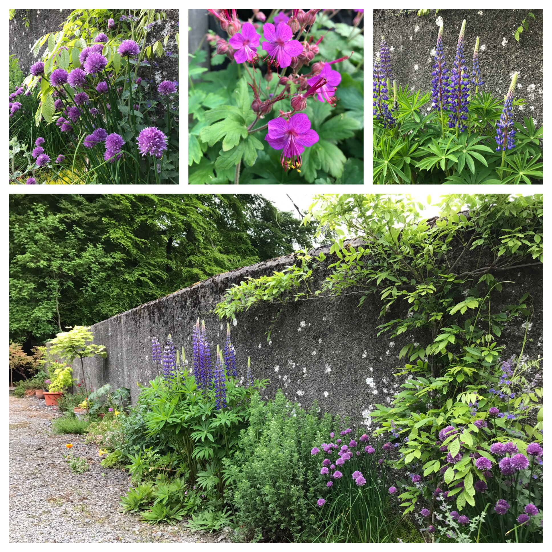 The wall runs along a driveway that has to be kept clear for the occasional farm machinery, and our deck areas are north west facing. There are rather unsightly portacabin structures and great big ugly concrete water tank. Despite all this, we have our haven of plants. Unusual trees and shrubs thrive, and standard trained shrubs such as Physocarpus opulifolius ‘Diabolo d’Or’ and standard gooseberry add height and detract our eyes from the unsightly structures.
