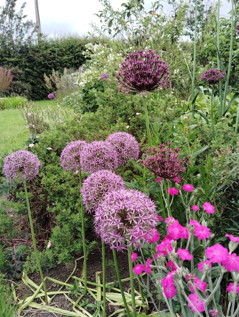In front of the rose and Physocarpus are a couple of alliums, the dark purple Allium atropurpureum and a new variety for my called Allium ‘Violet Beauty’.
