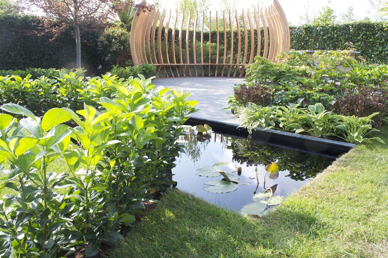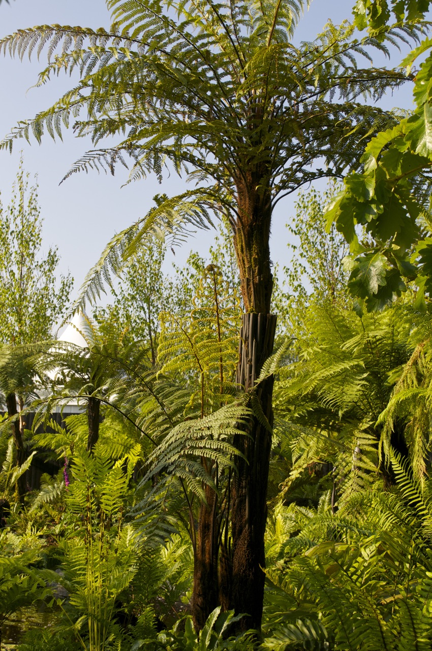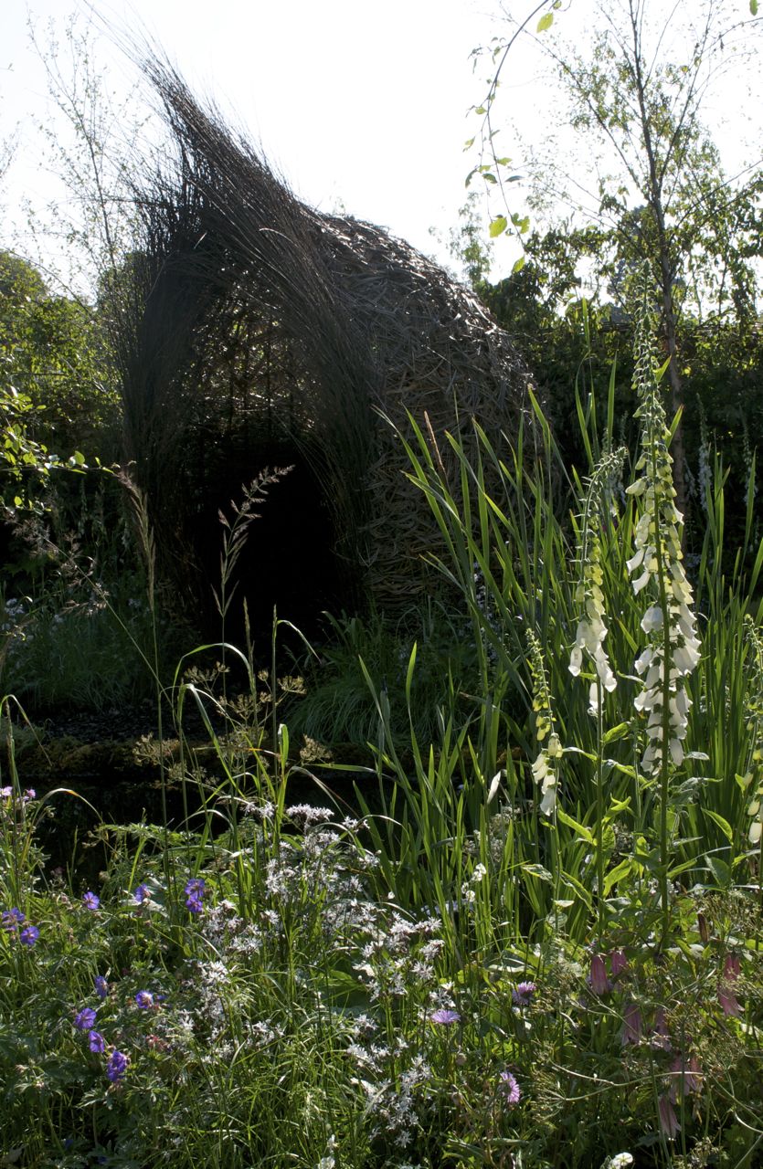 Created using natural materials and planted with a combination of both native and organic plant species to maximize biodiversity, the moist and magical atmosphere of a woodland garden oozes from the the earth and the structures. Constructed beneath the dome of a massive sculpture that mimics a woodland tree canopy, mosses and foliage provide a verdant foil for airy flowers of Rodgersia flowers. Pendant pods are cosy enclosures dangling from the dome, while the bog oak sculpture and framework is reflected in a still water pool. An intriguing garden that blends art and horticulture, wood and steel, natives and exotics; a beautiful garden combining humans’ artistry with nature’s magic.