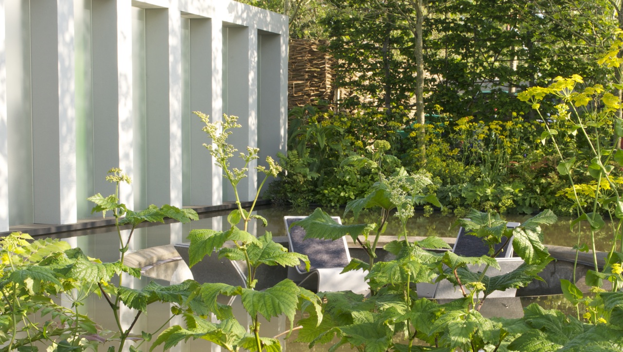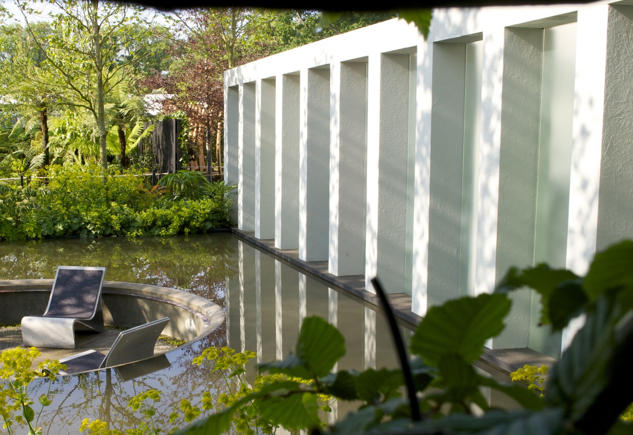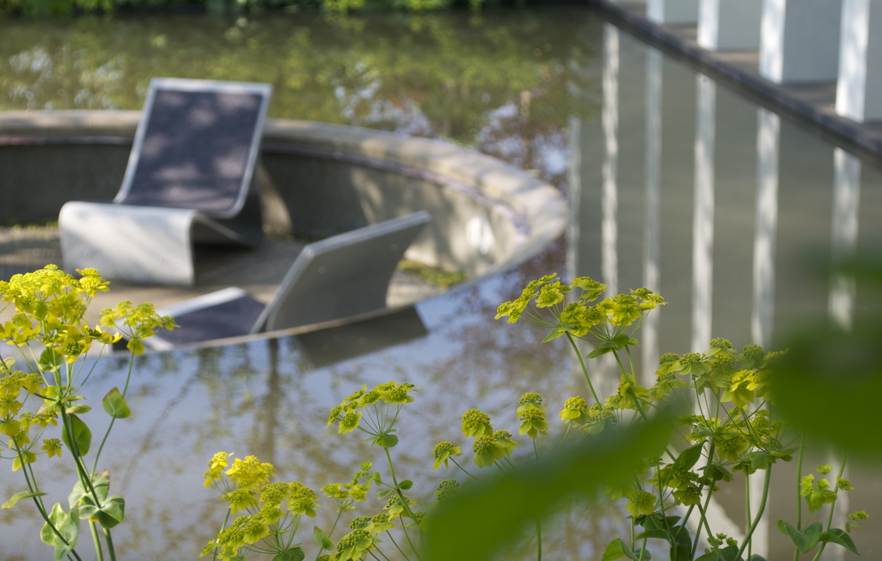 Few garden designers manage to capture atmosphere and mood in show gardens, at least not in the same way as Oliver and Liat Shurmann of Mount Venus Nurseries do it. Their entry into this year’s Bloom’s show gardens is to my mind the obvious choice of best in show, gladly, the show judges agreed. Plane trees create seclusion from the outside, their open canopies playing with reflections on the water. Borders of green and exotic foliage are dressed with euphorbia flowers, adding a sulphurous luminosity to the mellow planting. The sylvanian atmosphere embraces the water filled garden, where in the centre a sunken island invites you to cross a slightly submerged stone path. Circled around a central round channel, four stylish and modern seats demand that you rest and soak in the atmosphere. A trickle of water flows beneath your feet, creating a whirlpool pattern on the concrete surface. The mirror-like water surrounding the low seating area is an an ever changing canvass of reflection and light. Tree silhouttes, greens and reds of foliage play with the surface of the pool.