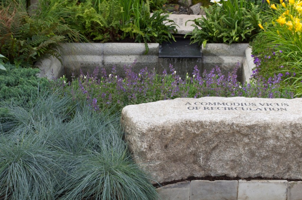 The Hidden Cube by Gary Hanaphy & Colm Quinn is a garden filled with modern urban style, an impressive pergola and geometric shapes, in particular, cubes. River Run Dublin UNESCO City of Literature Garden designed by Mary Ann Harris features quotations in stone, sculpture and planting with subdued use of colour.