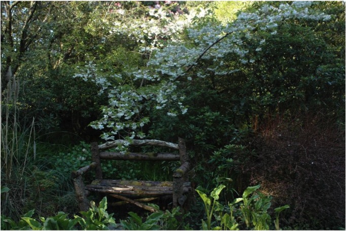 We walked to the Secret Garden, it was an orchard one hundred years ago. A previous owner had a greater desire for botanical curiosity than for home grown apples and now the low walled garden is a small woodland comprised of exotic specimens. We walked along the path, passing floriferous camellias, under the great Chilean flame tree, Embothrium coccineum, which in May is a blaze of red flowers. A great white Japanese cherry flowers above a rustic wooden bench. The big leaves of the American skunk cabbage, Lysichiton americanum, are growing in the wet, still in the infancy of spring they have not yet reached their dramatic summer size. Their yellow spathe flowers fill the air around the pond with a heavy odour. Further along the lady’s matle, Alchemilla mollis, lies at the path side still dressed with last nights rain drops. We stop to wonder at the size and beauty of the huge Magnolia x soulangeana, the biggest I have ever seen. From Mary’s Garden you can see it mingle with and rise above other trees. We walk the upper path and see the last flowers and big paddle shaped leaves of Rhododendron macabeanum. We admire the large trunks of the tulip tree, Liriodendron tulipifera, still undressed, the branches not yet concealed with its unusual shaped leaves nor decorated with yellow tulip-like flowers, not till July will the flowers appear. Just before we exit the garden we have to bow as we pass under a stretched out limb of Persian ironwood, Parrotia persica. Another naked tree, the leaves starting to unfurl. The bareness reveals a wonderful structure of twisted and spreading branches. Soon they will be covered in green foliage that will burn red and orange in autumn.