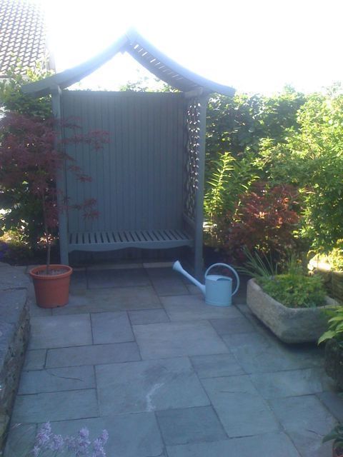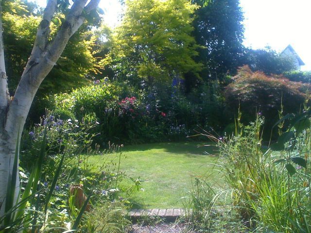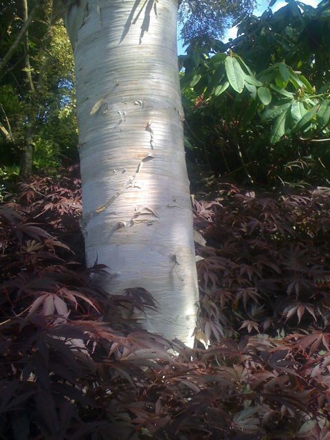On the patio, beside the path and by the front door, troughs and pots grow alpines and miniature hostas. In the back garden white stemmed Betula utilis var. jacquemontii are trimmed of their lower branches, they provide interest in the winter, shade and shelter for low growing red leaved Japanese maples, and structure through the year.