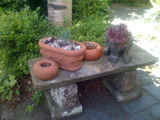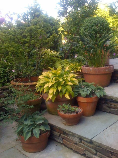 Cornus controversa ‘Variegata’ in front garden; coveted seat in front garden; hostas in pots; a group of Betula itilis var. jacquemontii in front garden; Miscanthus sinensis ‘Cosmopolitan’: lawn in rear garden; compost heaps; ceramic pot; Arisaema; hosta leaves