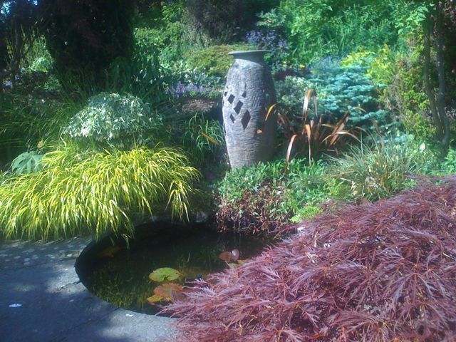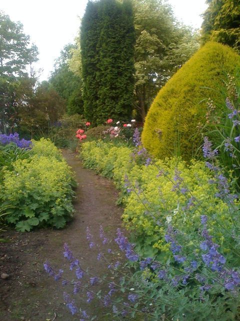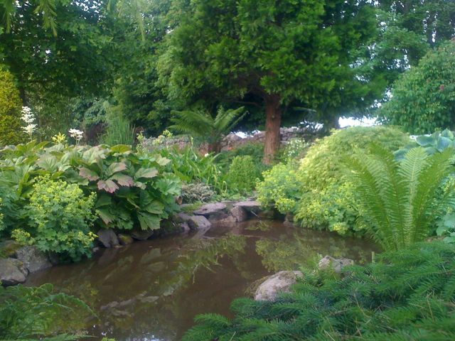 Her suburban garden in Glounthane, by the a sea inlet east of Cork City, is packed with plants, Surrounding perfect lawns, the borders of the front garden reveal little soil, a complete plant cover is created by a tapestry woven with shades of fren leaves and desorated by floral jewels.