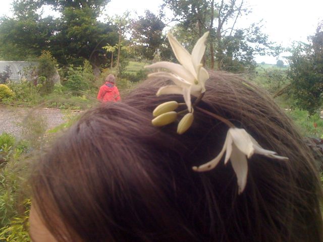 Walking up Lamb Hill to Huntingbrook; Meconopsis bectonicifolia, blue Poppies, in front of the beautiful glaucus shrub, Bereberia temolaica; dark foliage of Ligularia ‘Britt Marie Crawford’ with ferns and lush green foliage; Minnie enjoying the attention of Hanna and Anu (our fabulous tour guide); ornamental grasses under Aralia echinocaulis; Holboellia chapaensis (HWJ 1023) a plant from the nursery Crug Farm in Wales, the flowers smell like cucumber!; Hanna wears Holboellia flowers on her hair; Lupins flower beneath Aralia echinocaulis.
