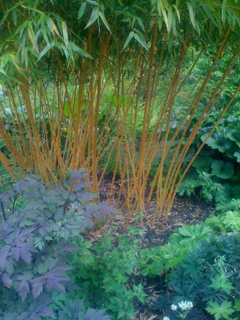 Aralia echinocaulis planted en-masse always looks stunning, the borders beneath them recently replanted are already full of colour and promise of later beauty. Dark foliage of Ligularia ‘Britt Marie Crawford’ contrasts with fresh green fern fronds in the adjacent border beside the house.