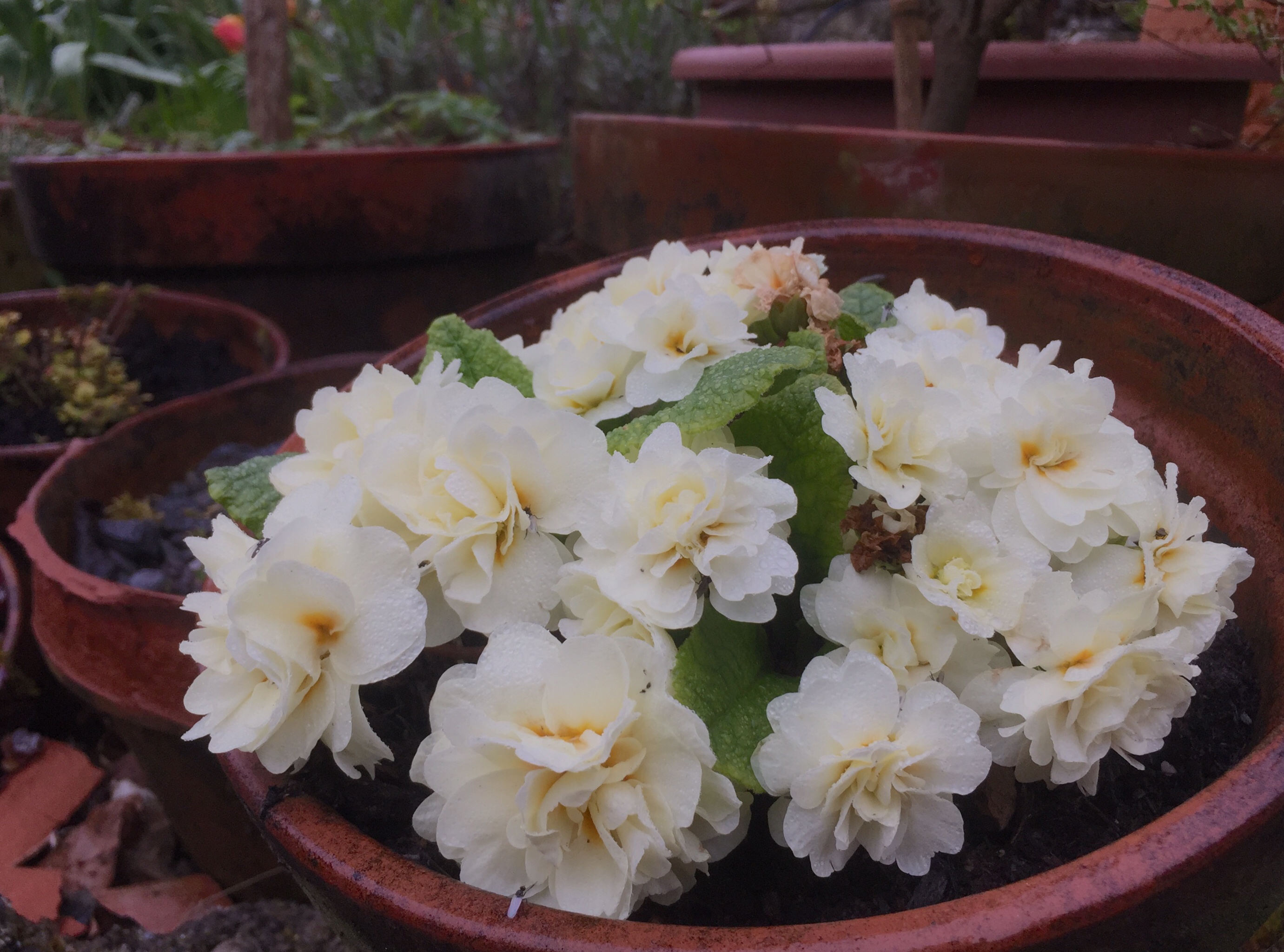 Just as pull the zip up to its full collar limit, and I grimace in annoyance at the wet world, gentle yellow frills catch my eye. I teeter on my feet, my motion halted, indecision holds me on the balls of my feet, until my body weight surrenders to the changing mind and the creamy yellow ruffles of the Primula ‘Belarina Cream’. As i bend down to admire it, insects unbothered by the precipitation fly off in annoyance at my presence, a few return.