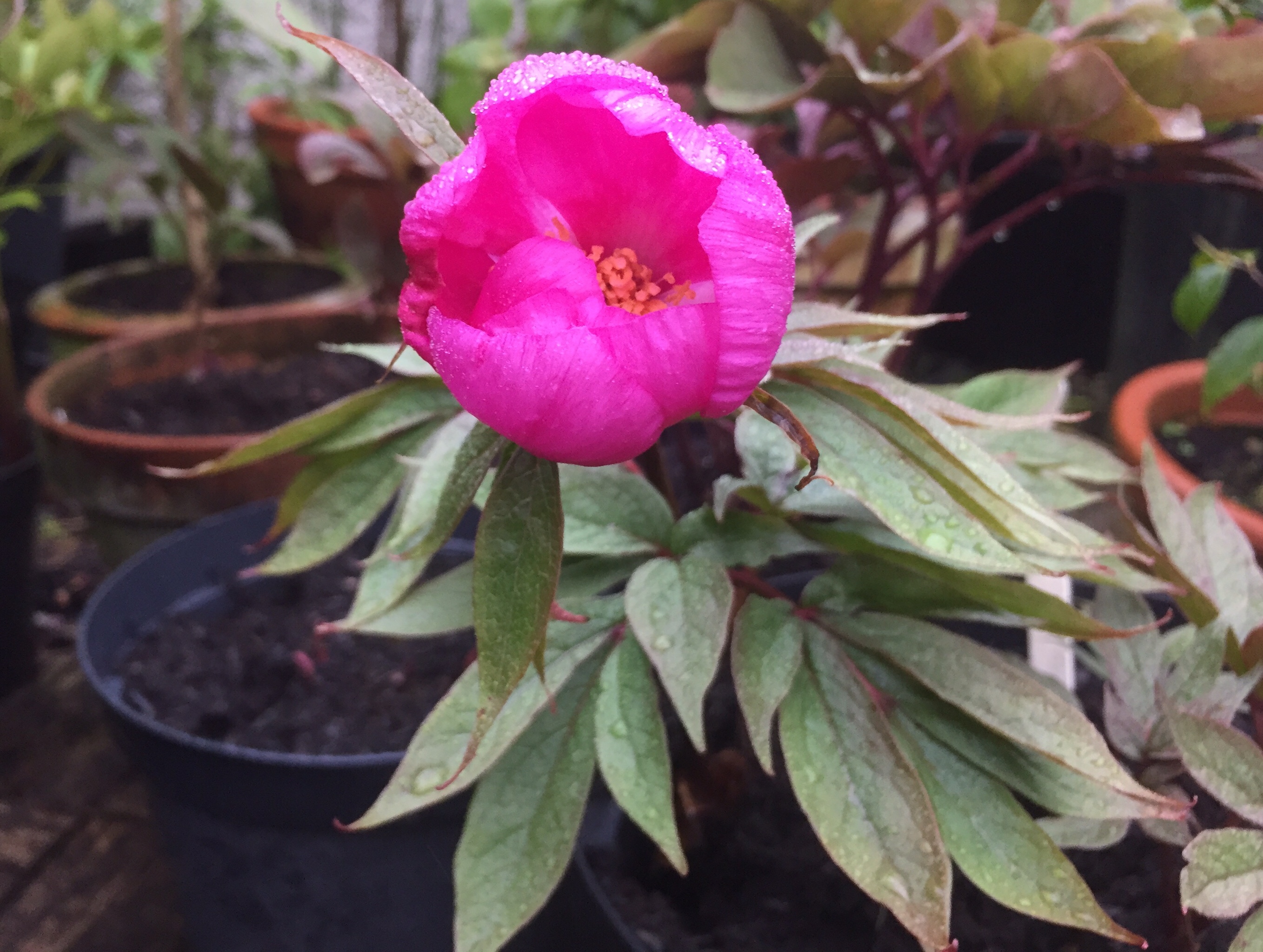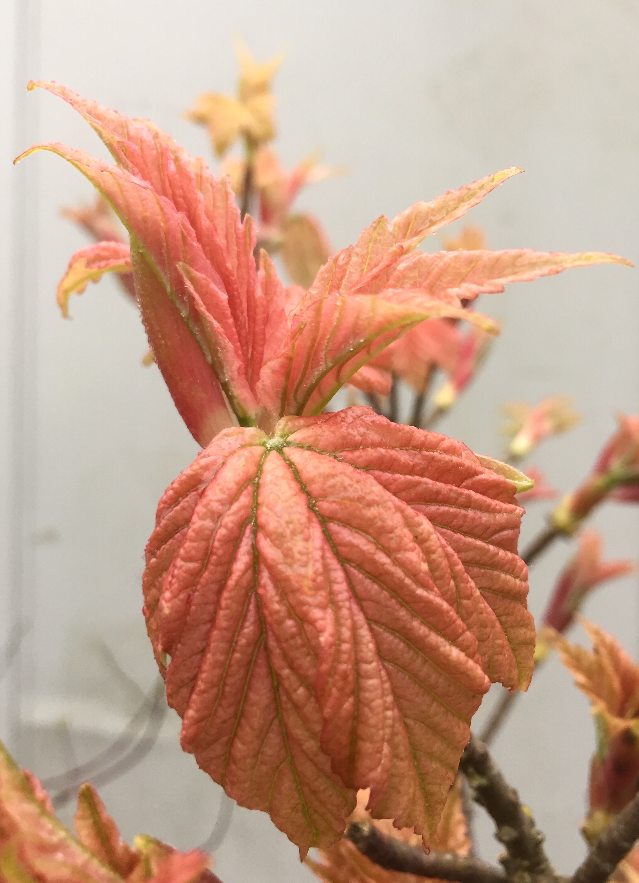 Then as I straighten up, a peony bud is winking at me, opening up and exposing its hidden treasures, of its promise of beauty wrapped in pink petals. Now, the once annoying mist does not mother me, i walk in the wrong direction, looking for buds, and blooms. The burnished salmon leaves emerge from the spring buds of Acer pseudoplatanus ‘Brilliantissimum’ an enchantment of rich textured venation, its moment of glory before the opened foliage turns to somber and sulky pale yellowish green.