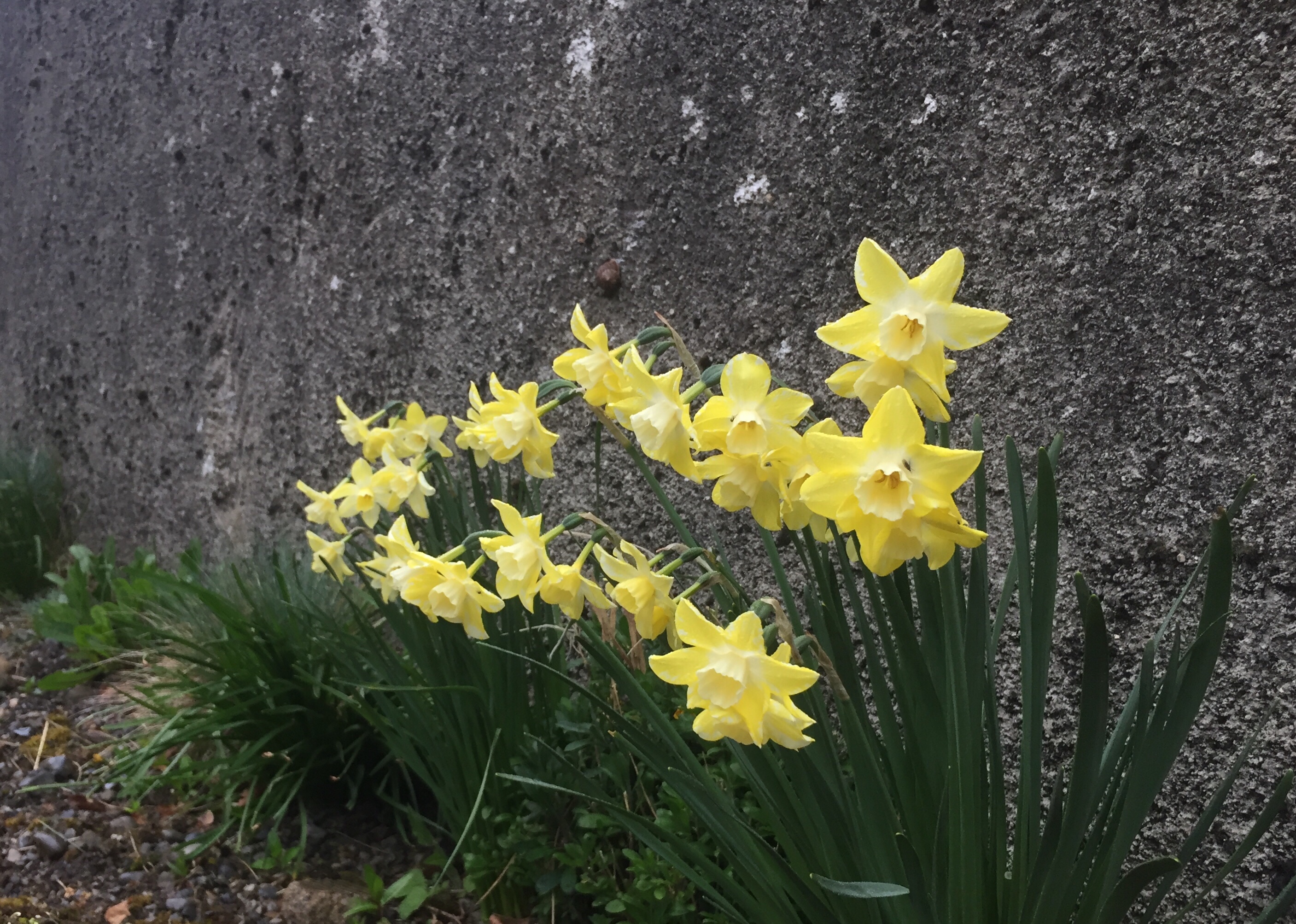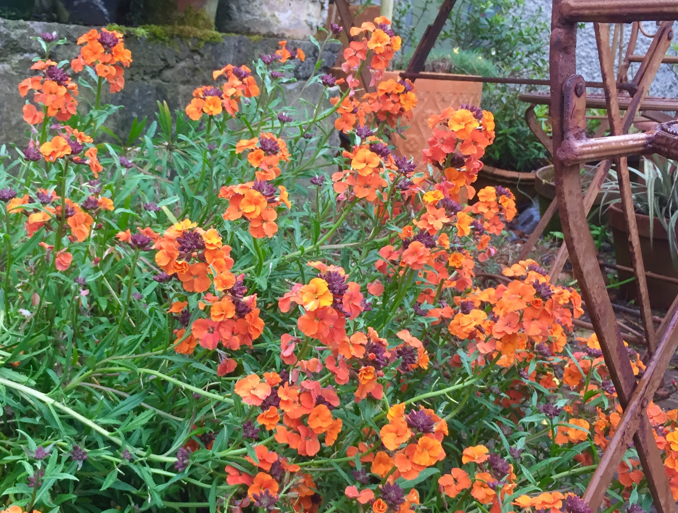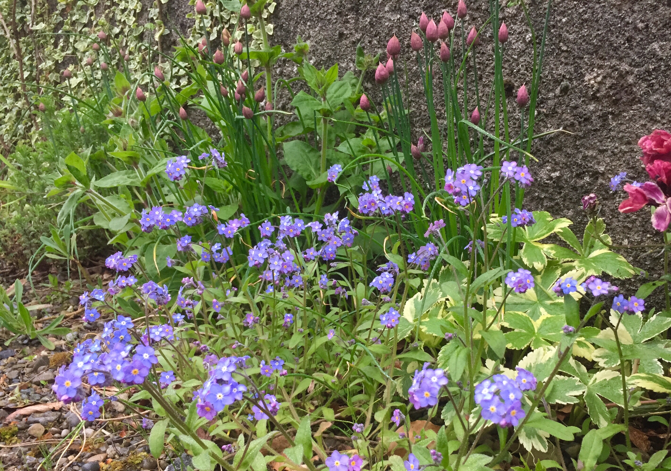 Forget me nots and wallflowers in the gravel at the base of the wall. Apart from our container garden, we have planted a strip of about 20 metres in length at the base of a wall.