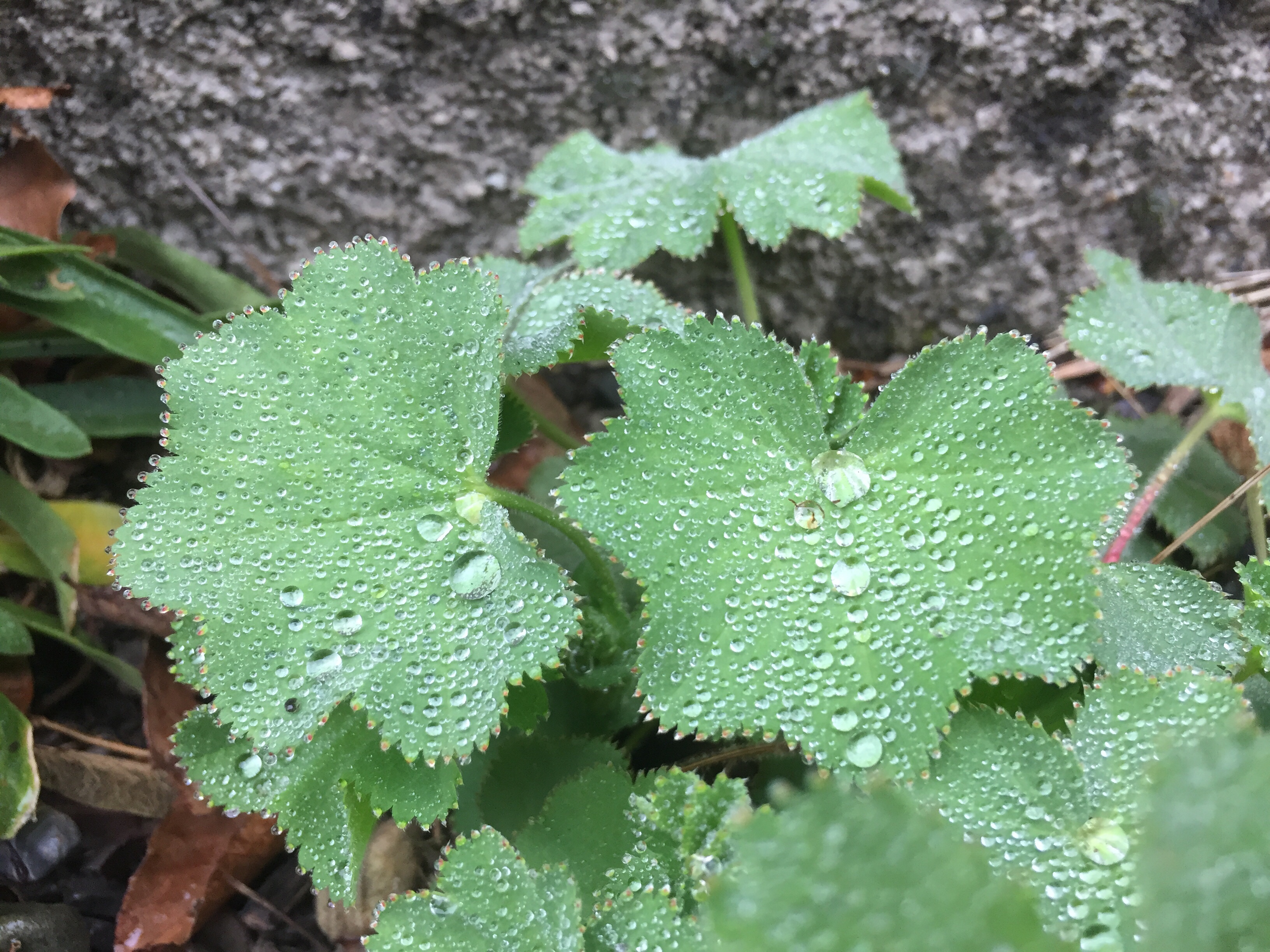 I am now slowly making my way to the van, Anthemis punctata subsp. cupaniana reaches out to demand my attention, its first white daisy blooms a promise of summer, while lady’s mantle, Alchemilla mollis, uses its soft hairy leaves to collect as many droplets as it possibly can, coating its leaves like a greedy jewel thief.