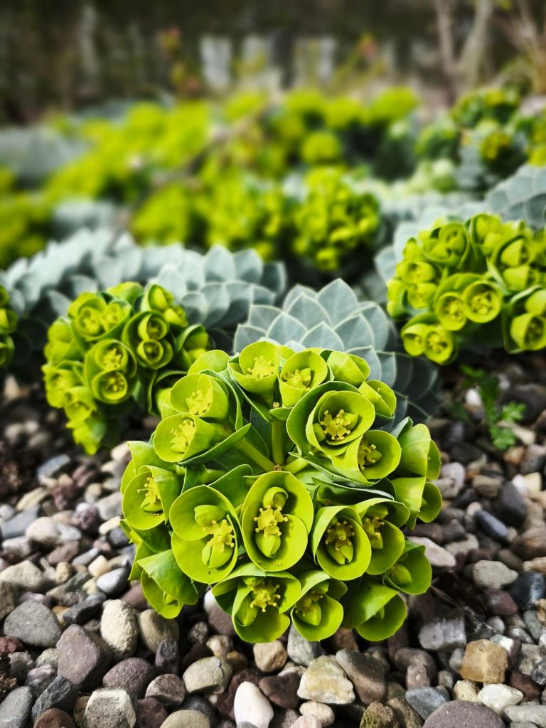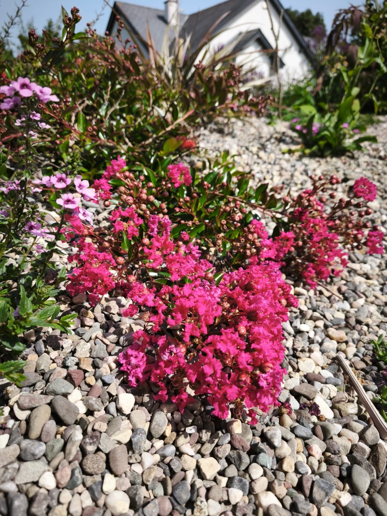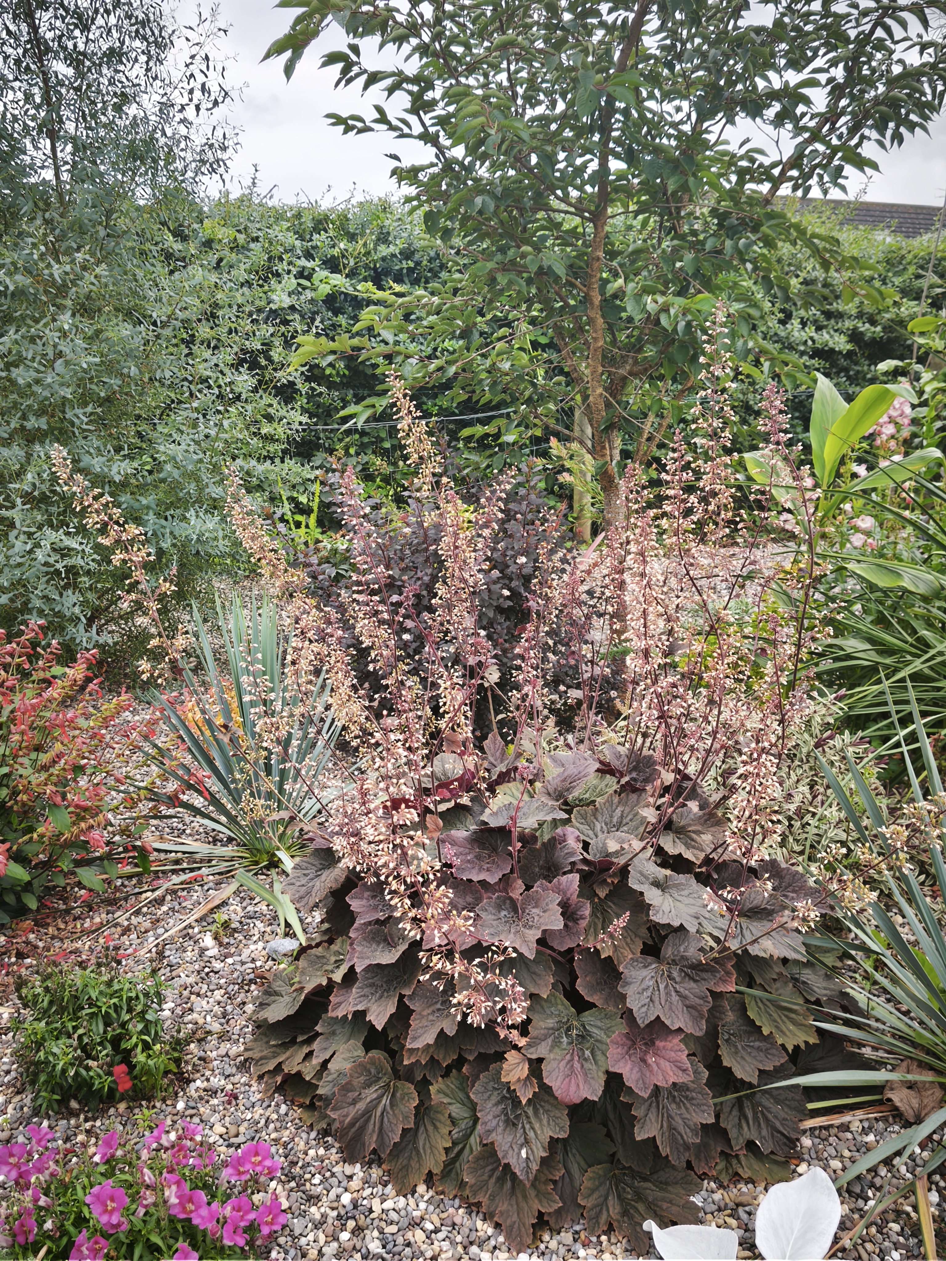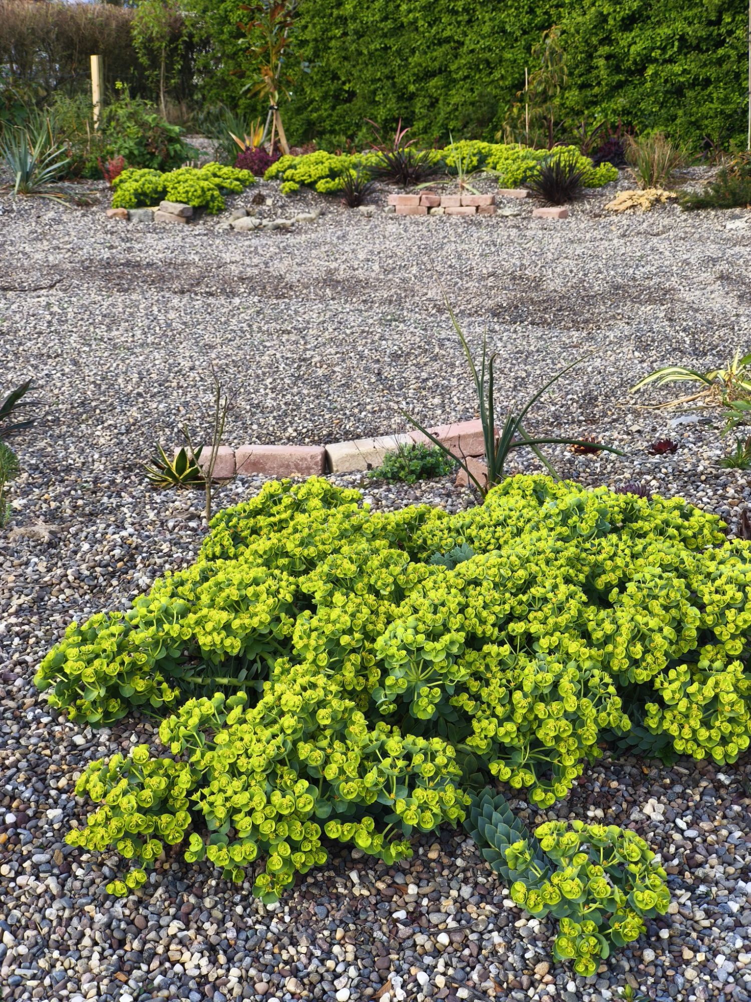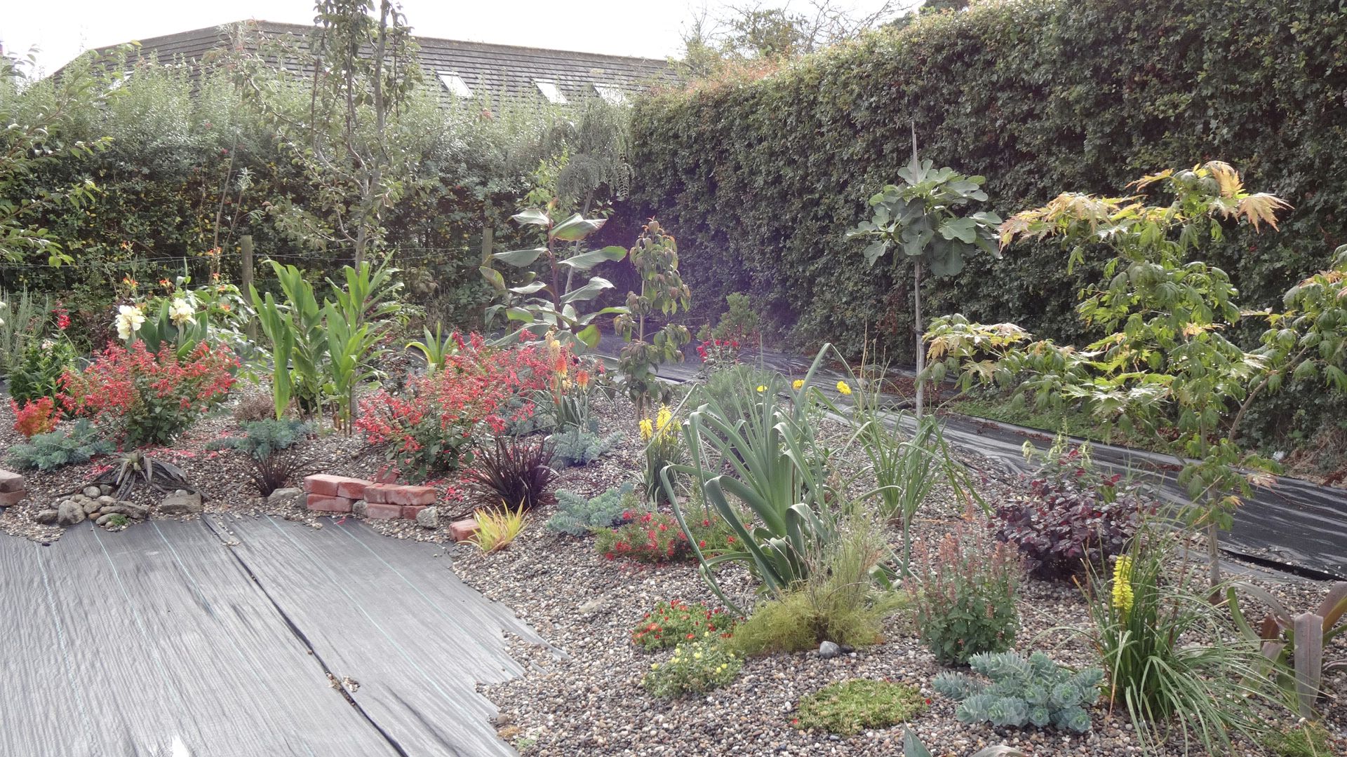 The aim is for a colourful and intriguing low maintenance area; weed control membrane is used and covered with decorative gravel.