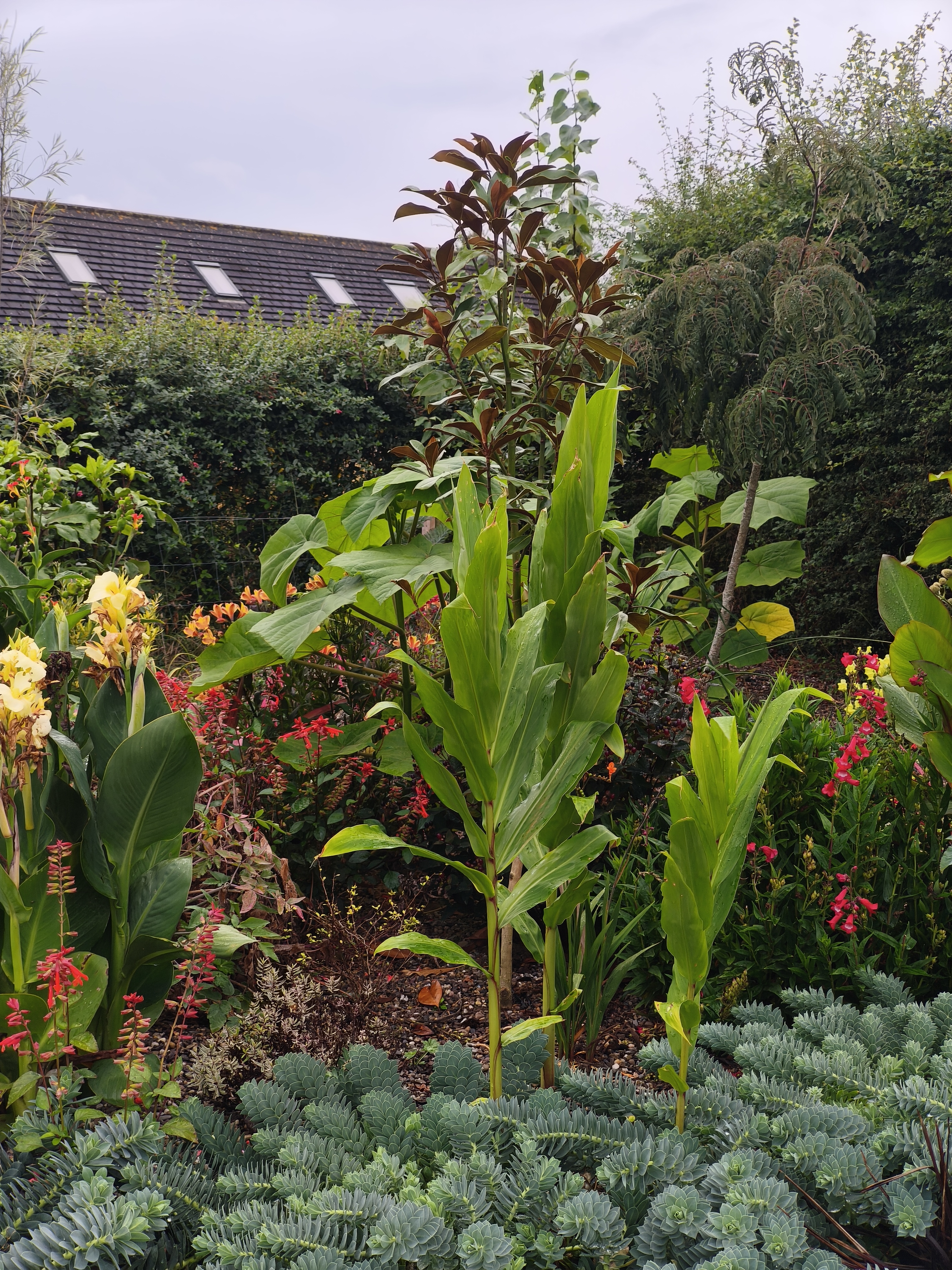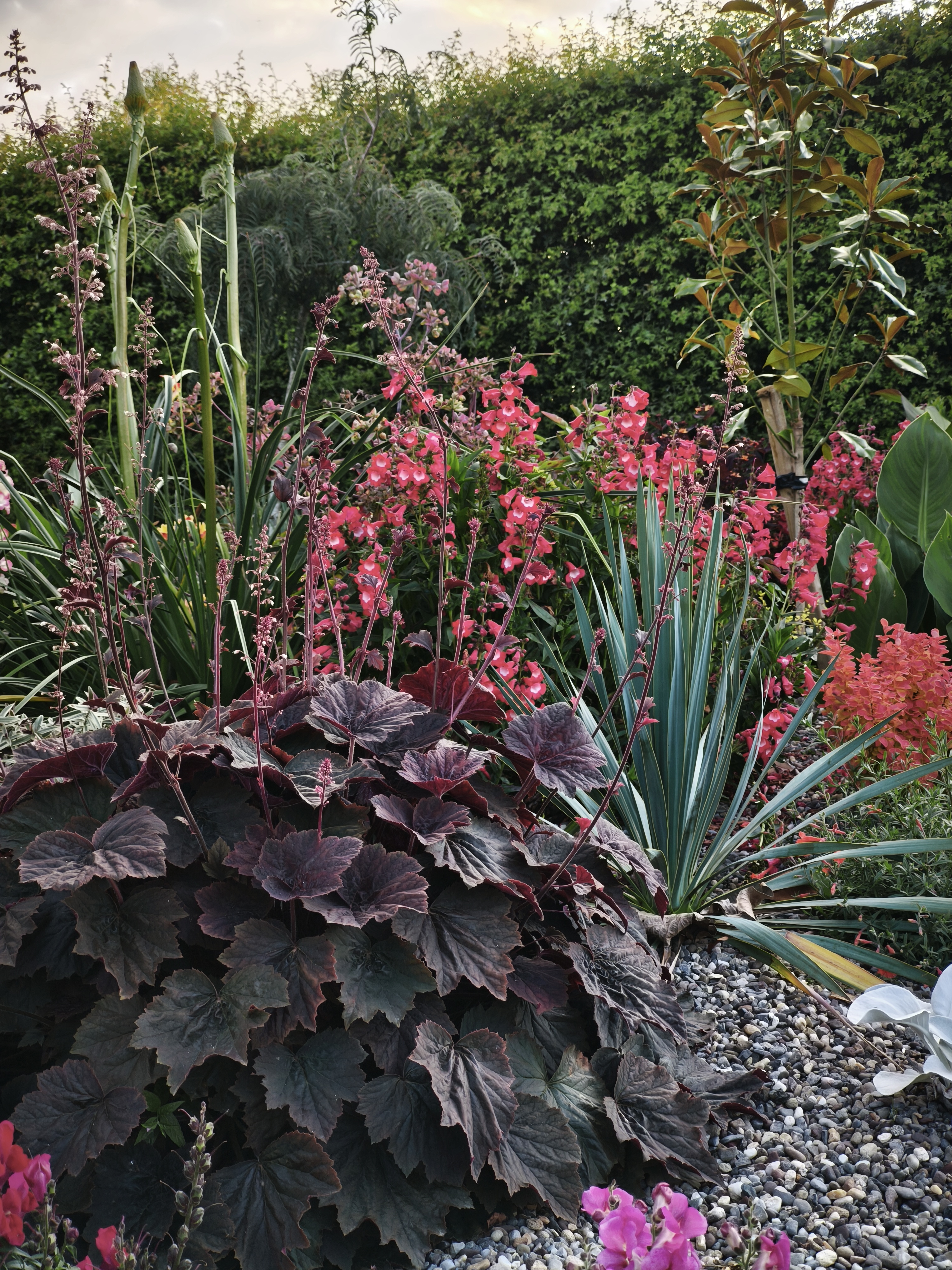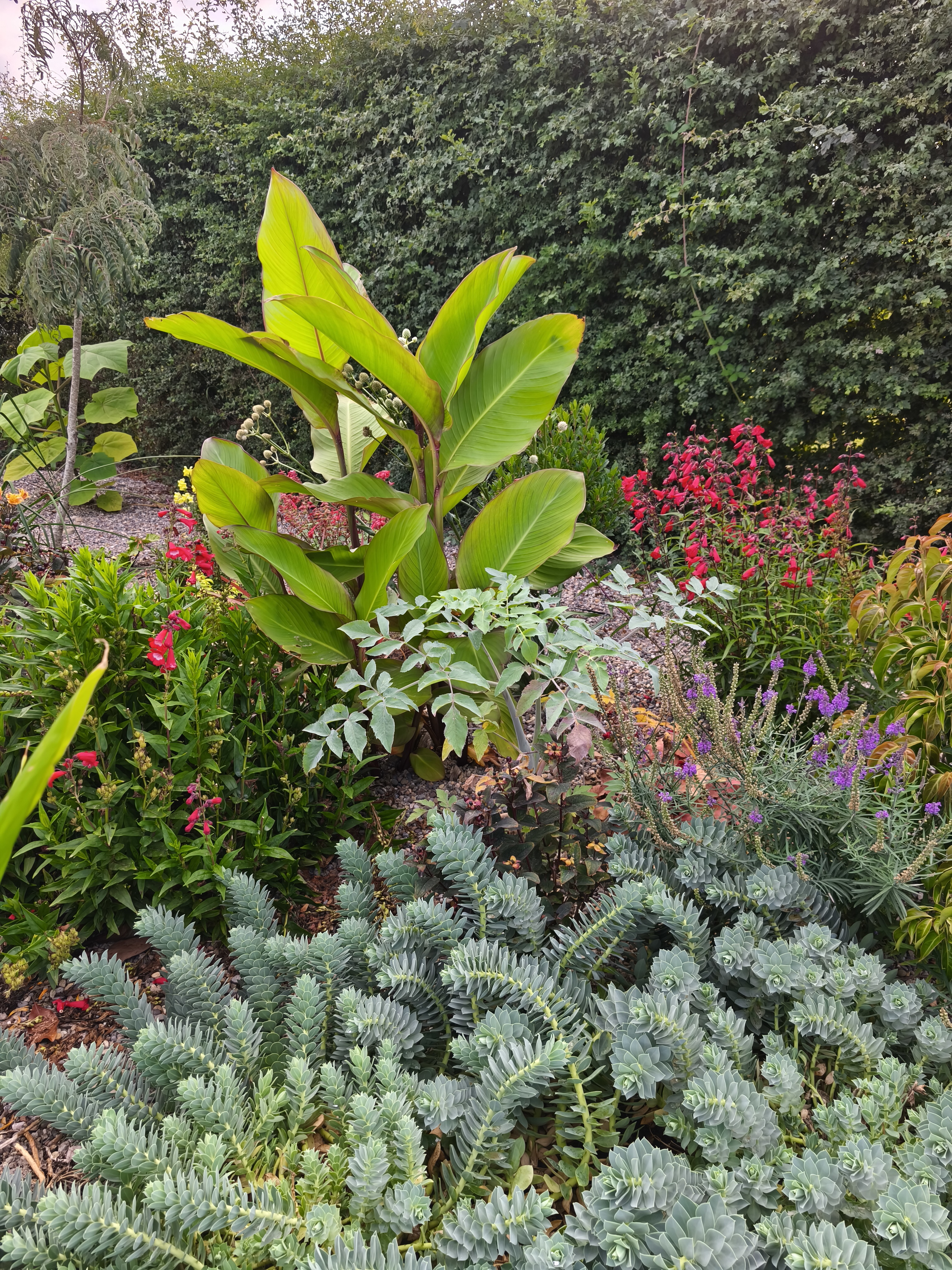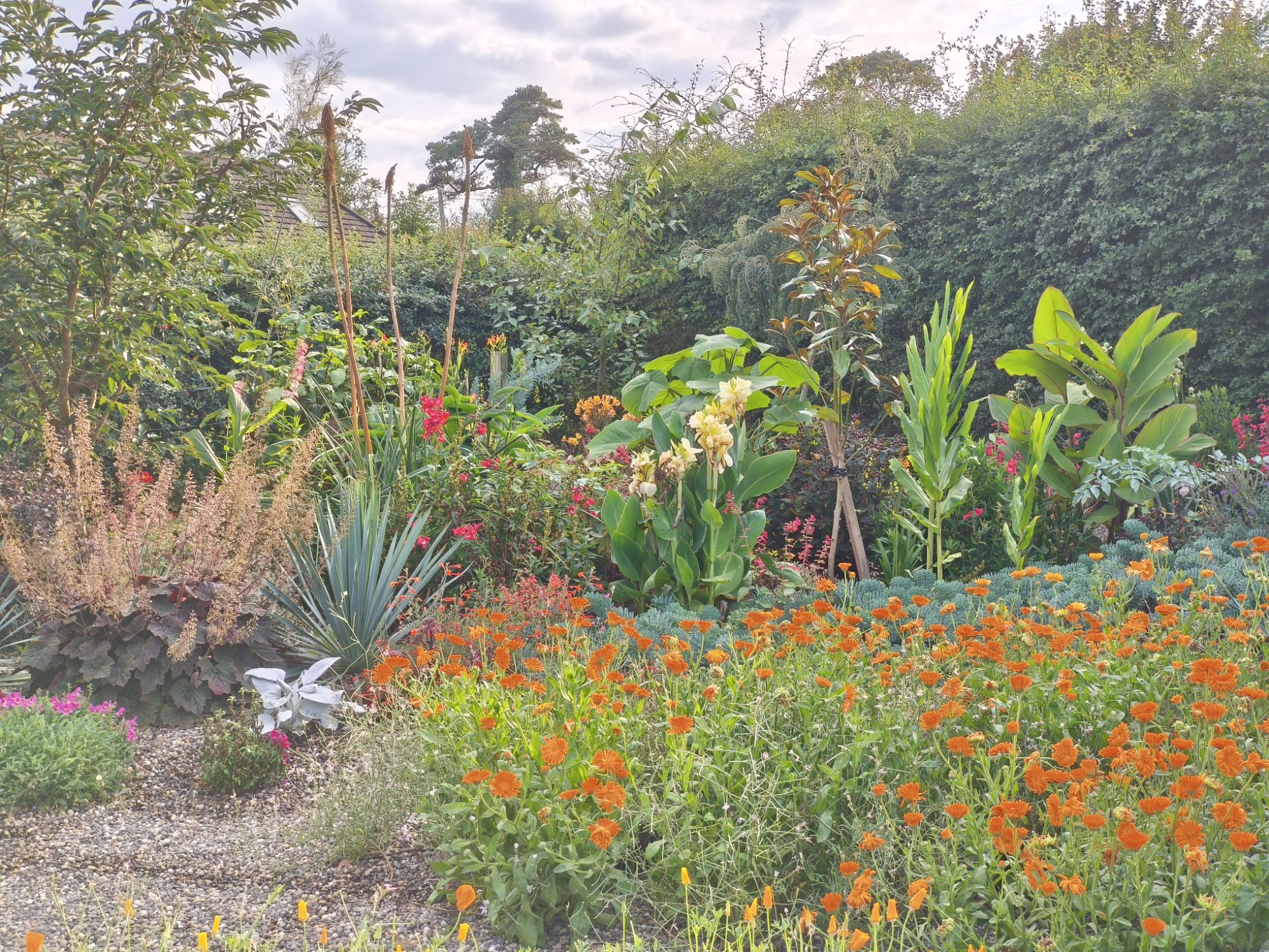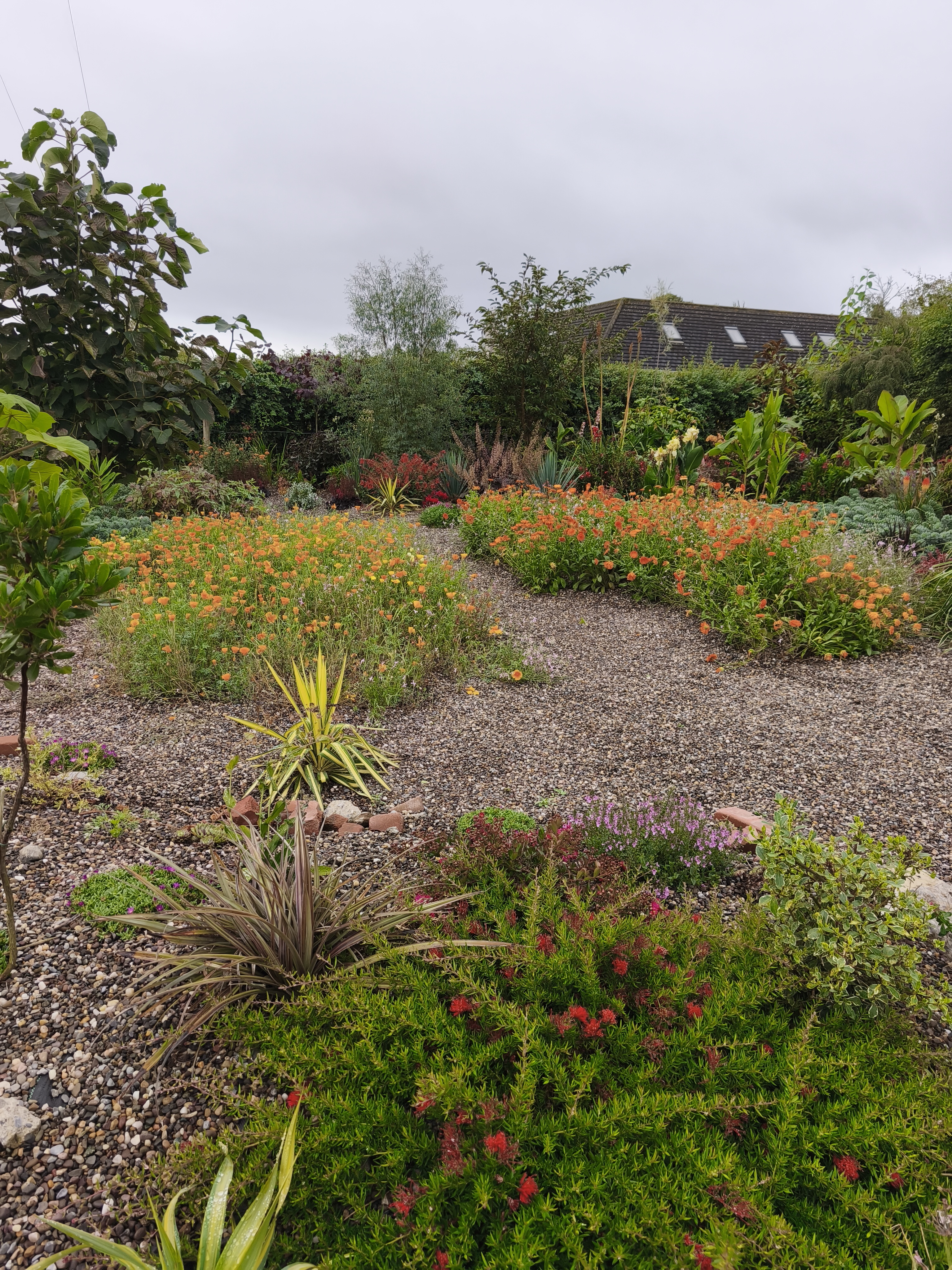 This space is a newer area, where once was a trampoline, there now grow drifts of annual flowers, surrounded by mounds of soil planted with Mediterranean-style flowers and exotic foliage plants.