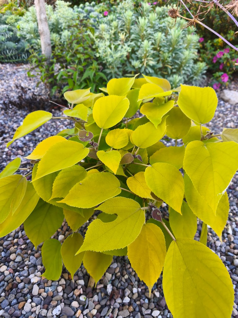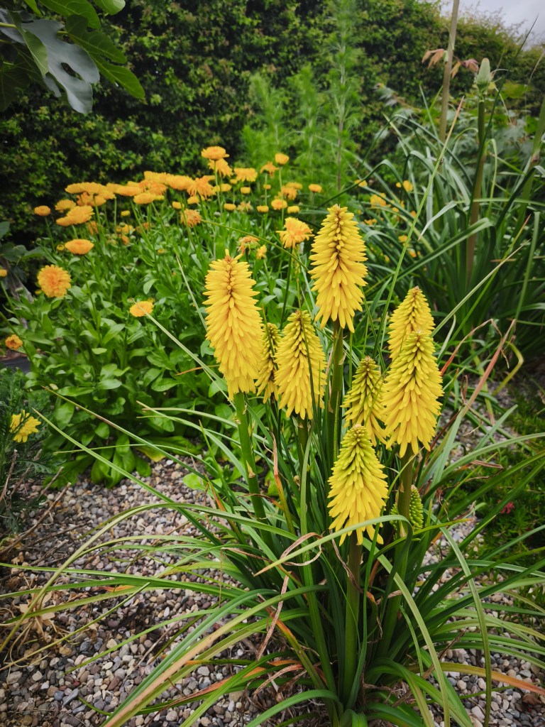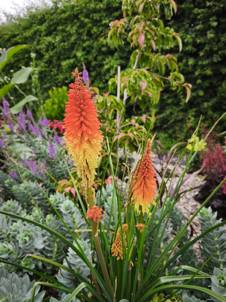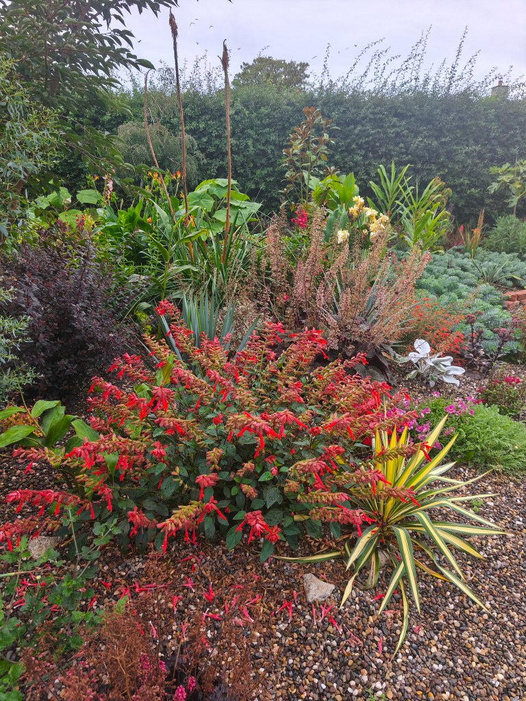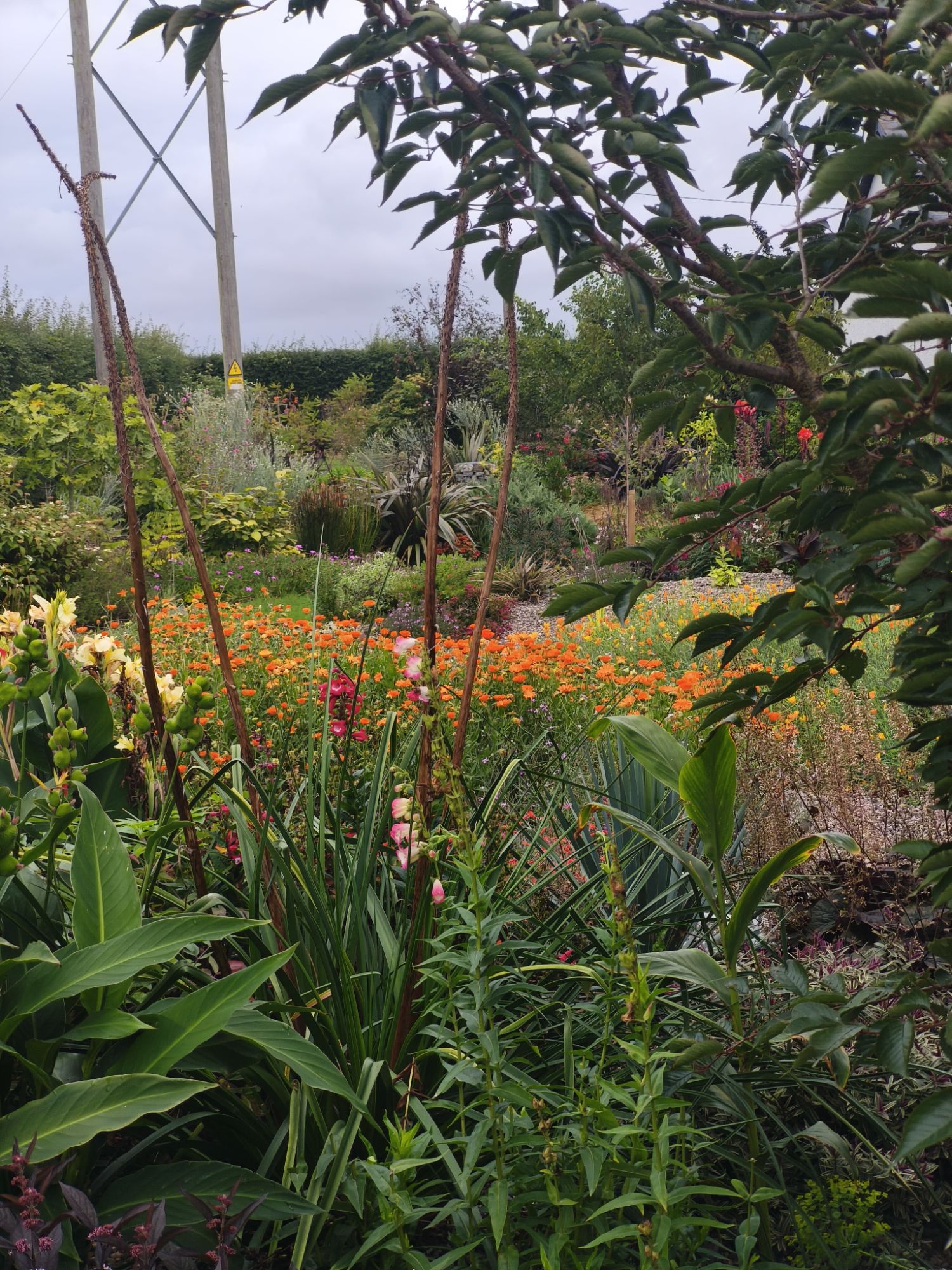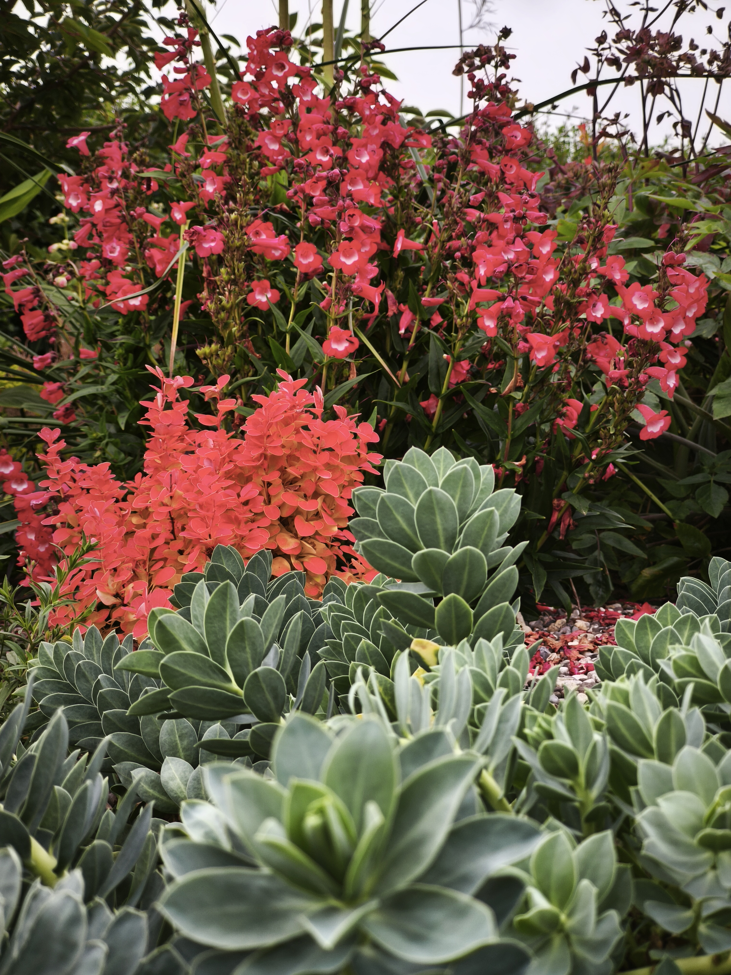 This space is a newer area, where once was a trampoline, there now grow drifts of annual flowers, surrounded by mounds of soil planted with Mediterranean-style flowers and exotic foliage plants.