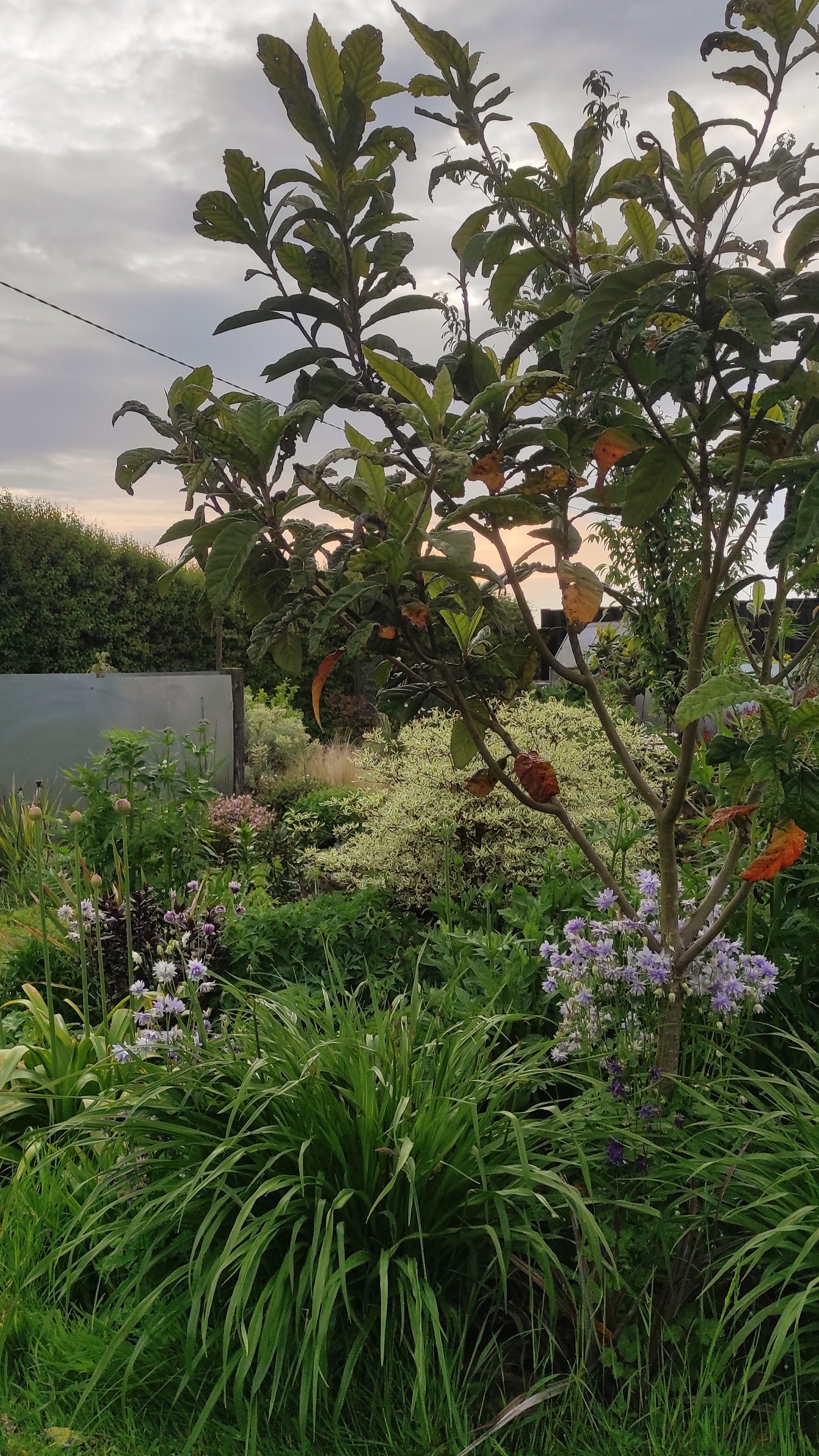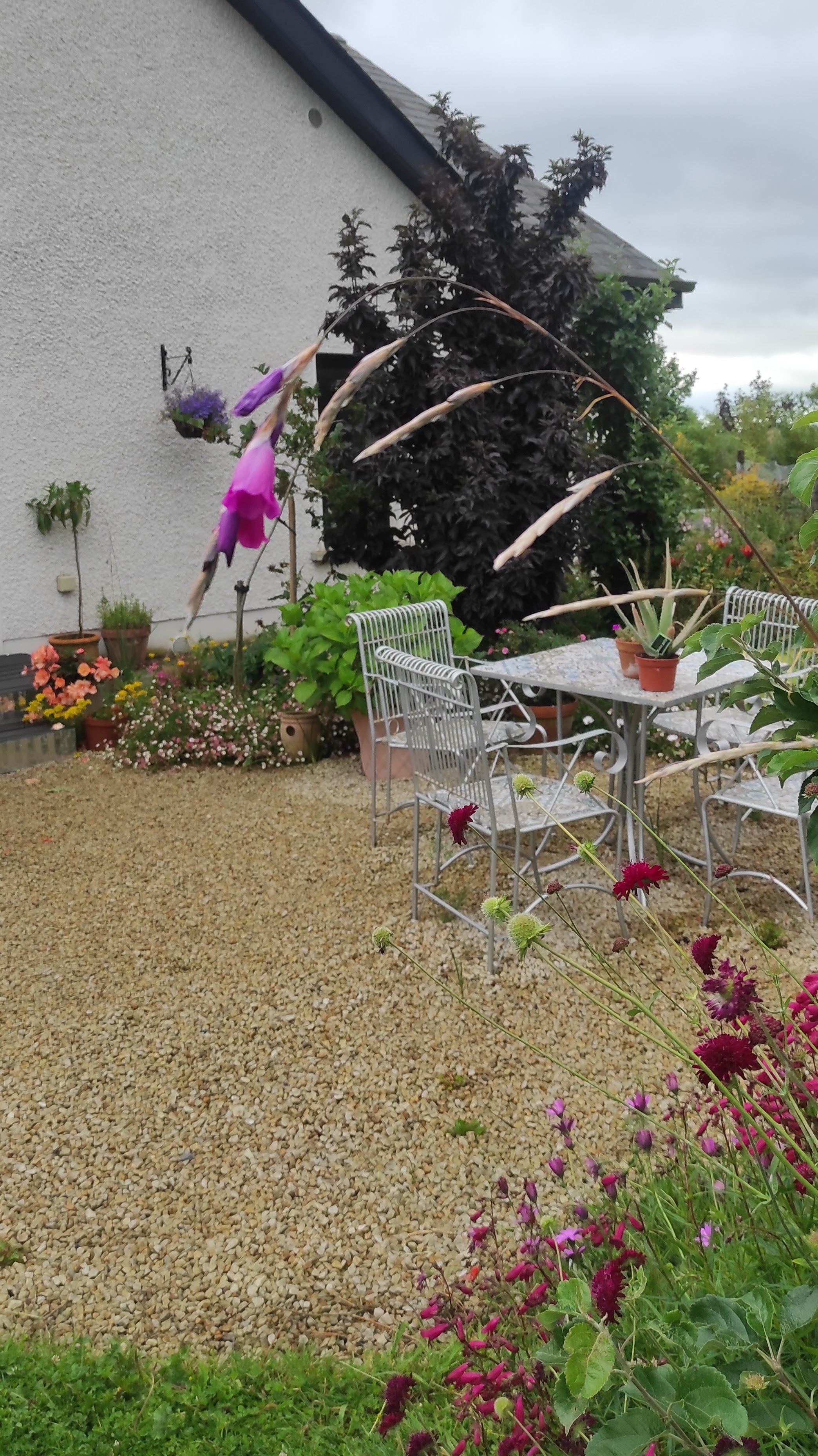 Here is a small selection of the plants in the Patio garden areas. The surface is stone chippings, the Mexican fleabane plant, Erigeron karvinskianus, edges most of the circumference of the circle. Shrubs, some trained on stems provide shelter and privacy are undeplanted with herbaceous perennials and smaller shrubs to provide foliage and flower interest throughout the year.