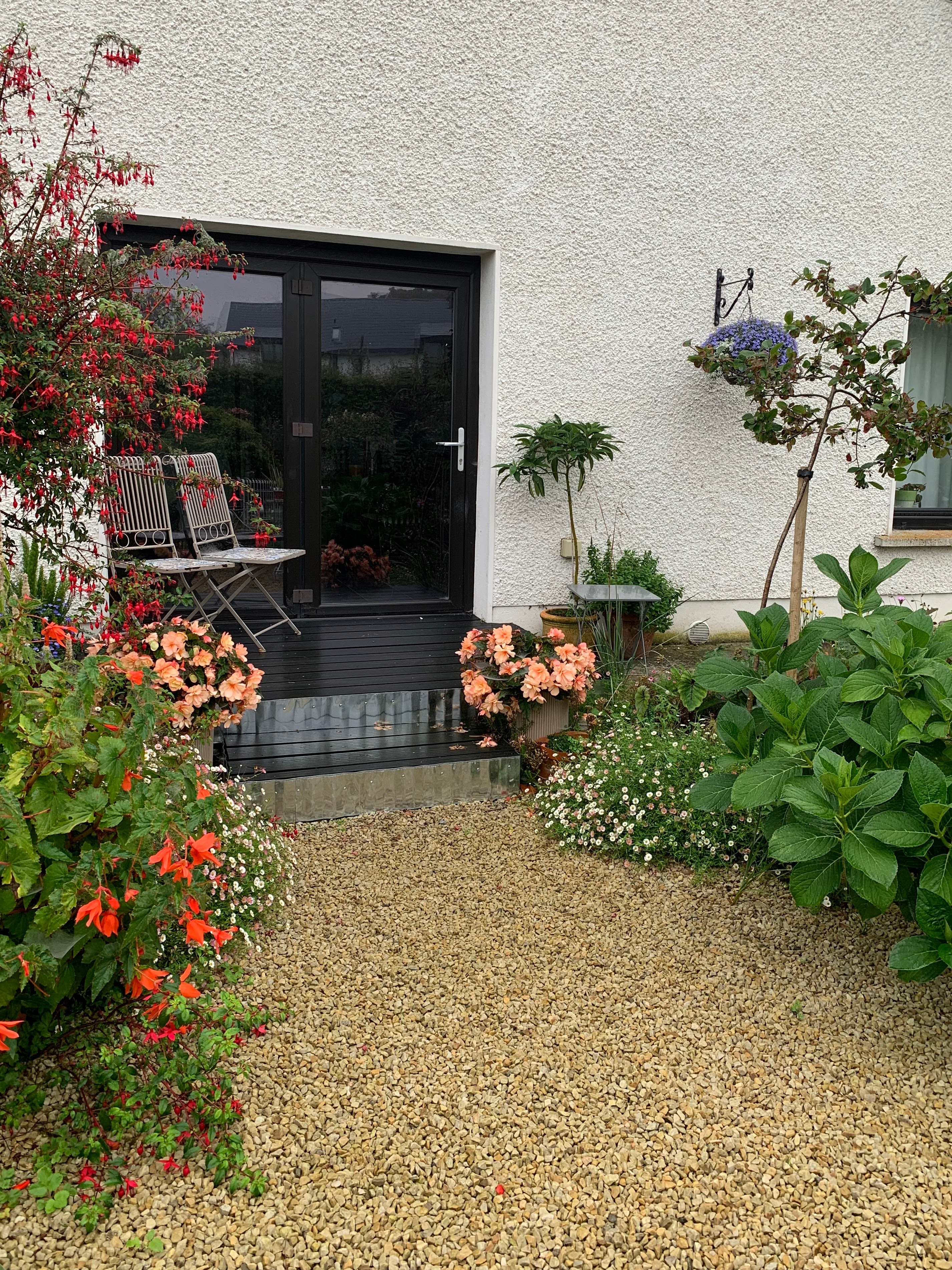 The patio doors face east, the area gets sun from mid-morning from Spring to Autumn, and the last of the summer sunshine on mid-summer days.