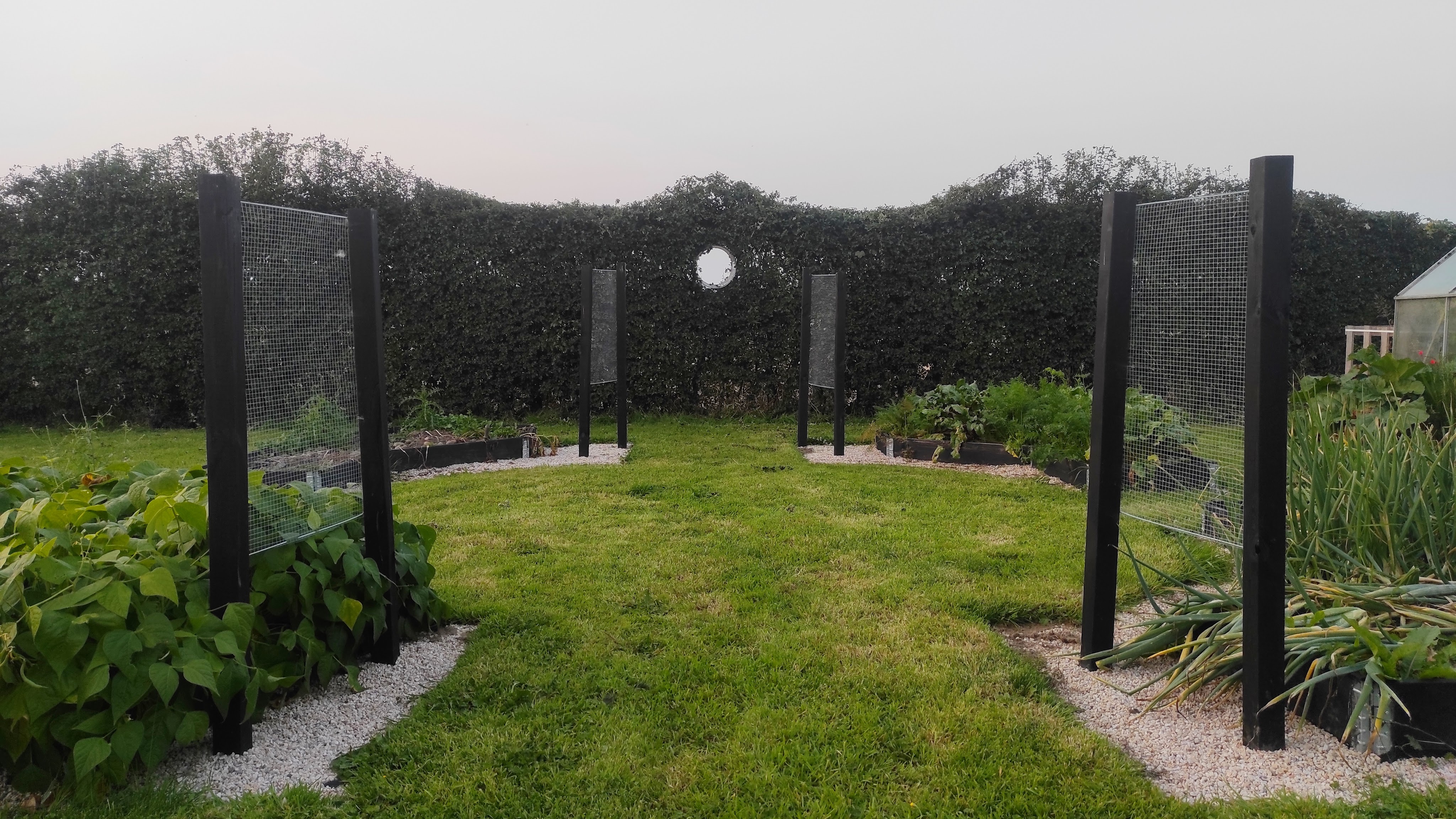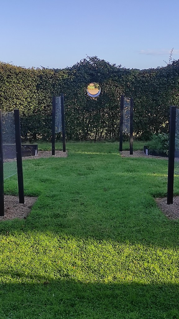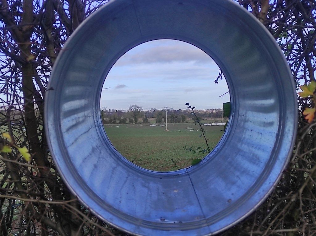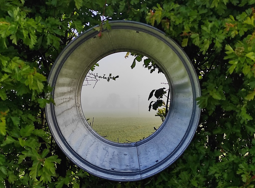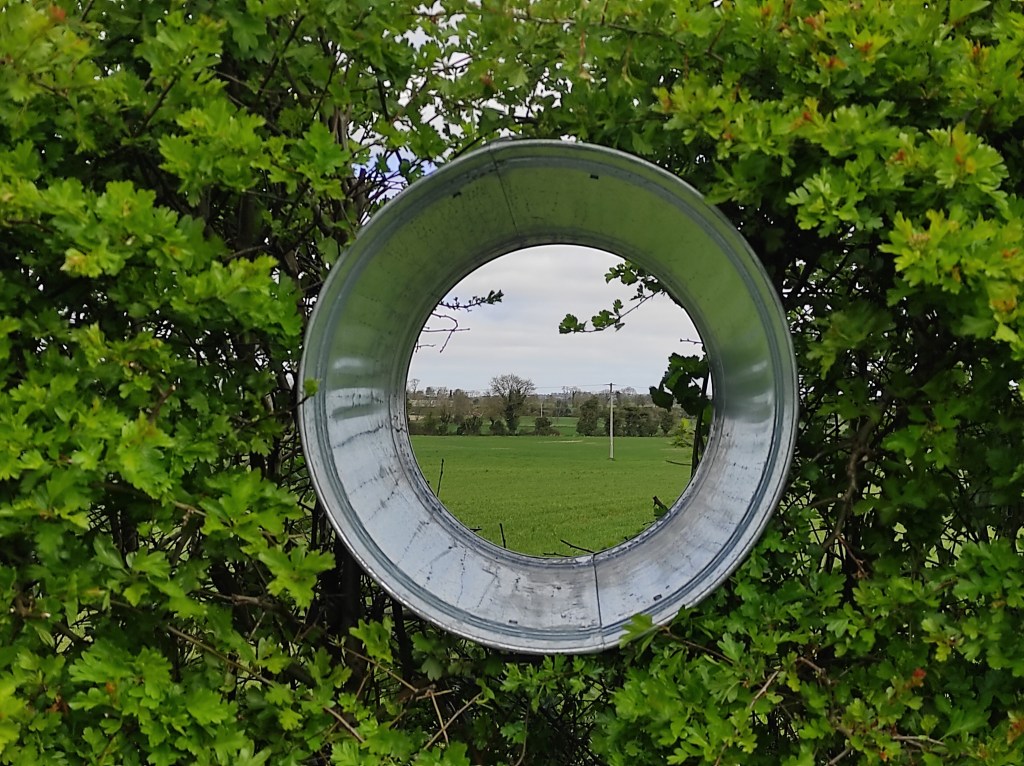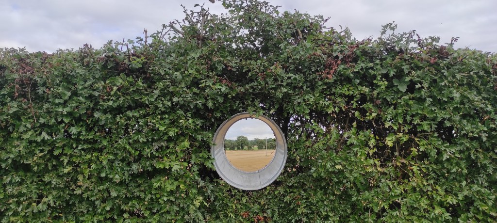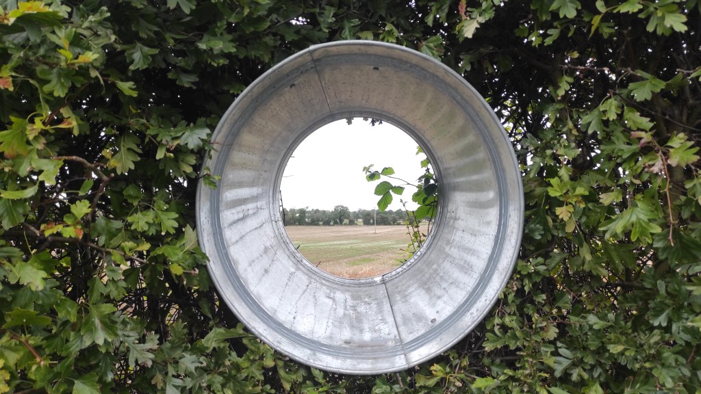 I used a galvanized bin, I cut the base away, and insetred it into the hedge to create the spyhole.