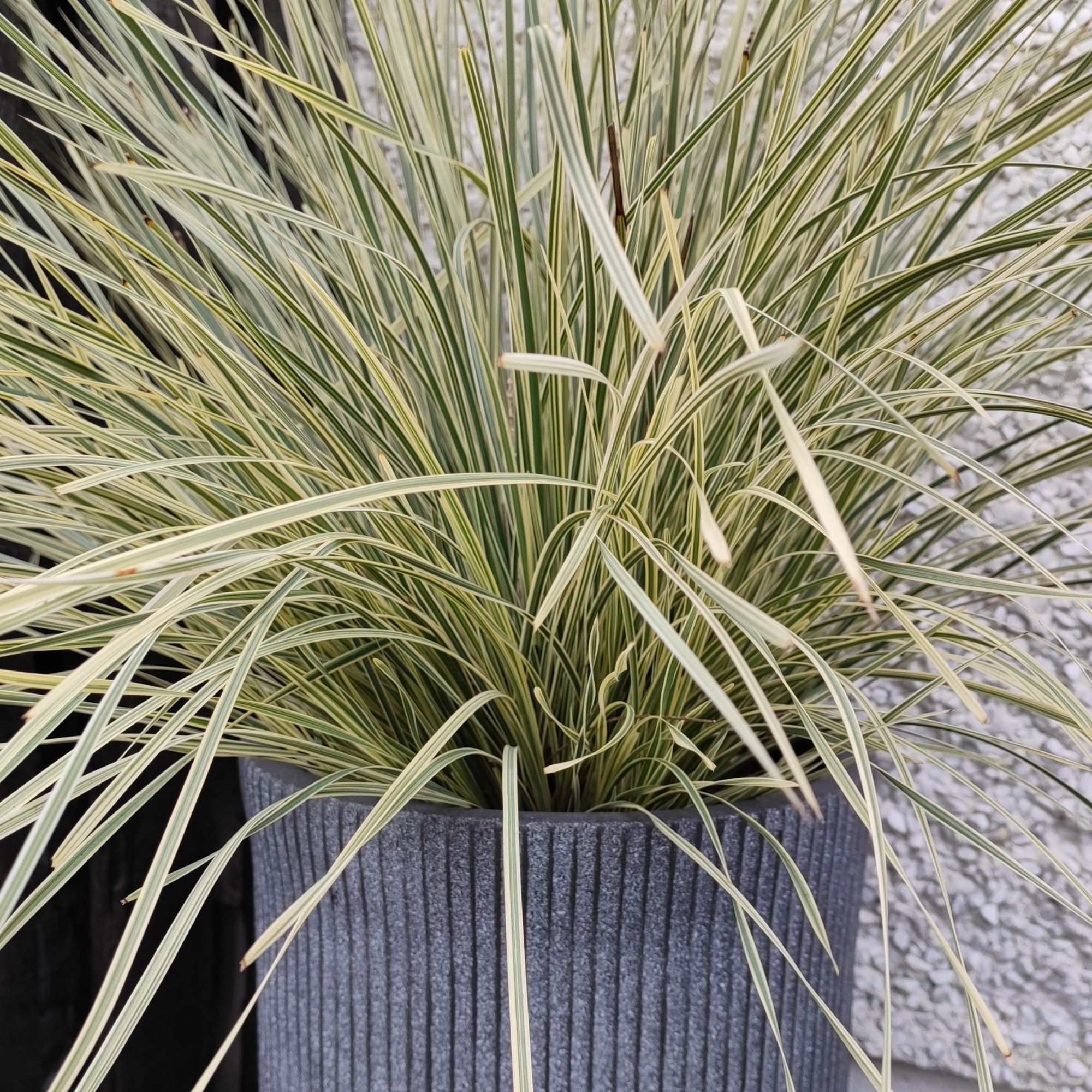 Although it looks like a grass it is not a grass: hardy, evergreen, variegated foliage, it makes graceful clumps in the garden or in pots.