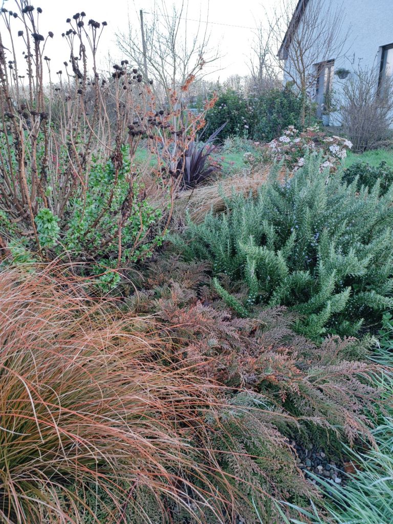 I have planted a good number of plants of trailing rosemary in the Pylon Garden area. I wanted evergreen foliage, that was dense to help suppress weeds, but was decorative too. The grey green aromatic foliage is perfect for combining with decorative stone mulch.